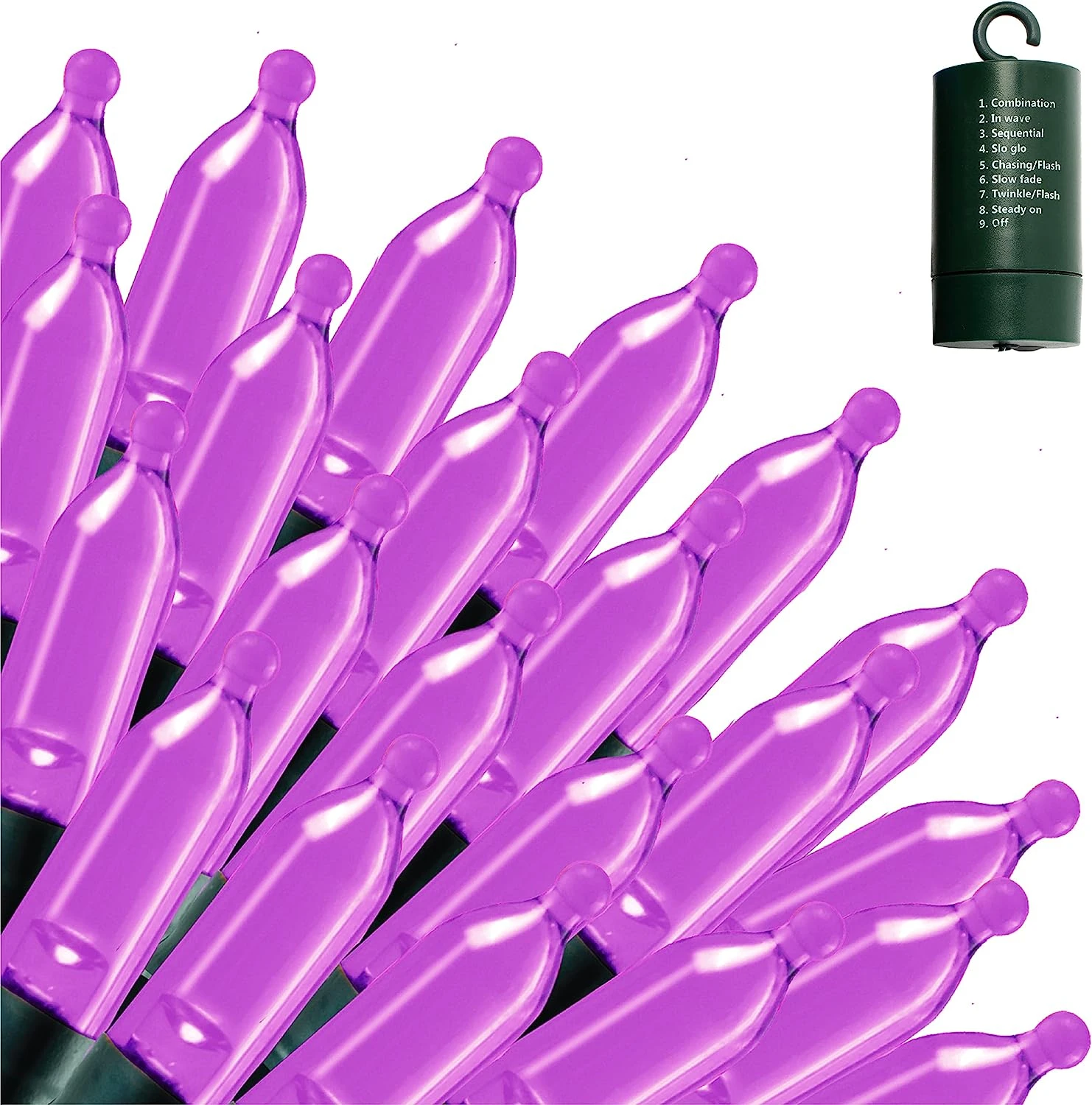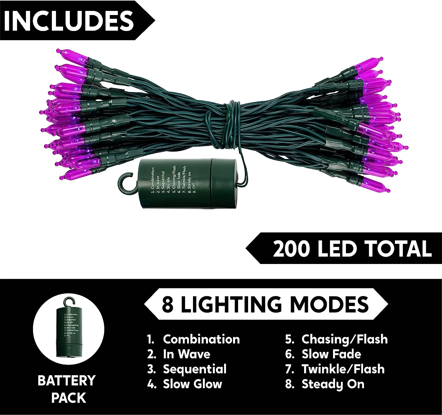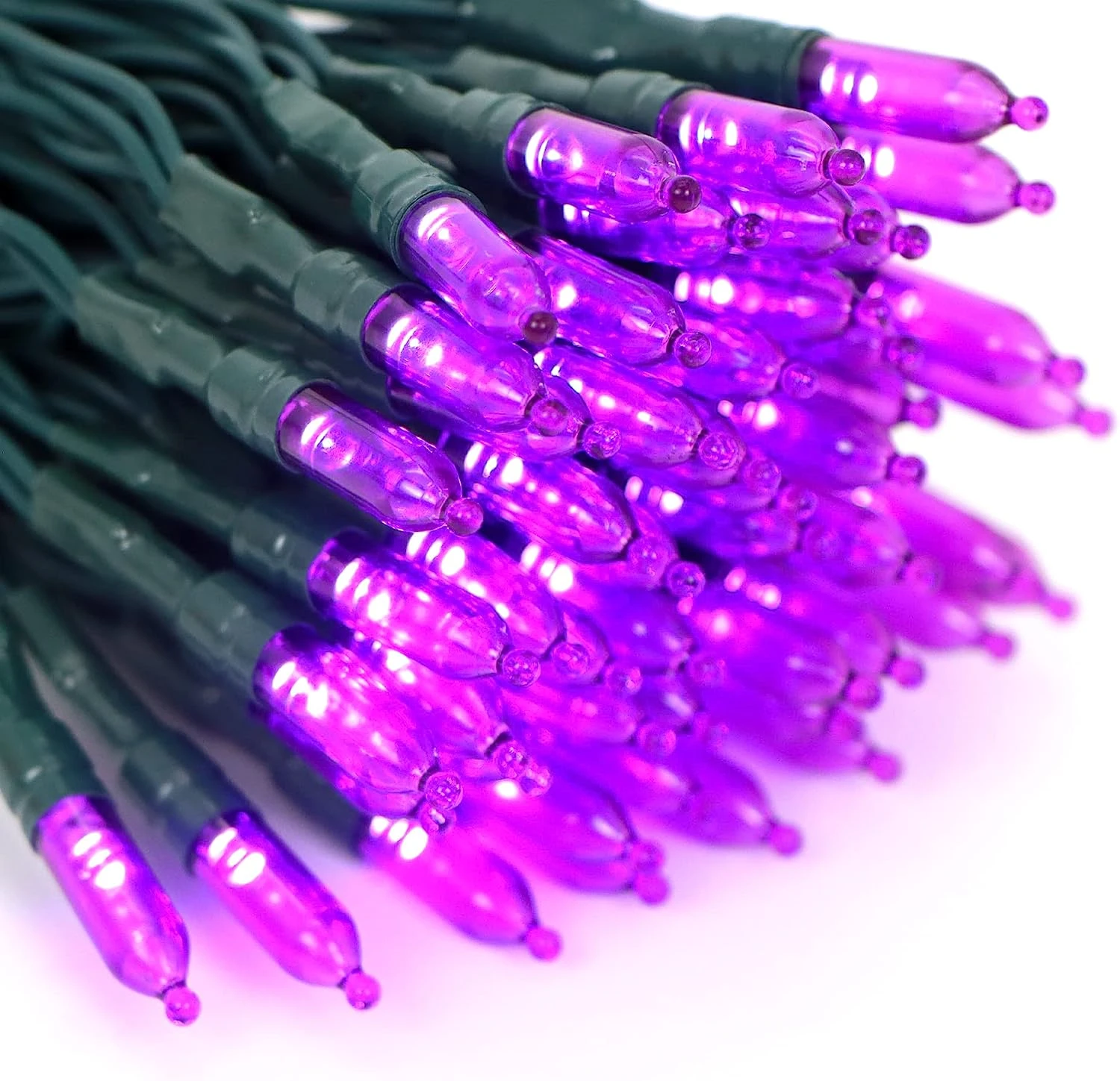 - Our holiday lights set is composed of 200 counts of purple LEDs in green wire string lights. These are also battery-powered string lights (battery not included) with measurements of 67.3ft. The spacing for each bulb is 4 inches with each bulb’s size of 3mm*16mm.