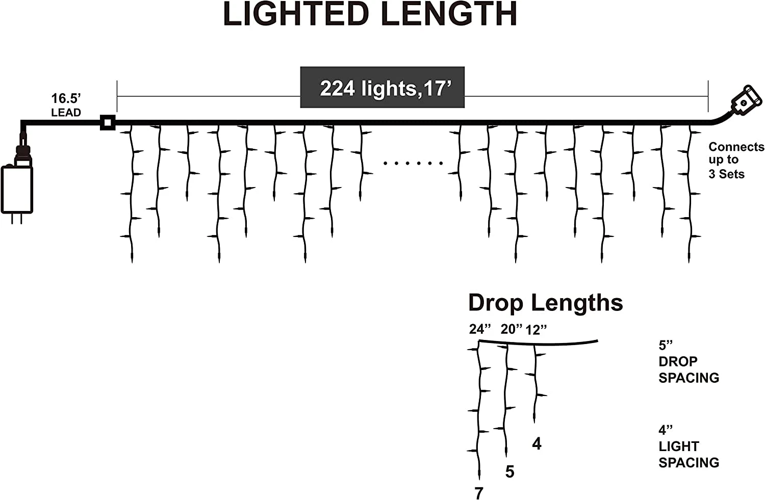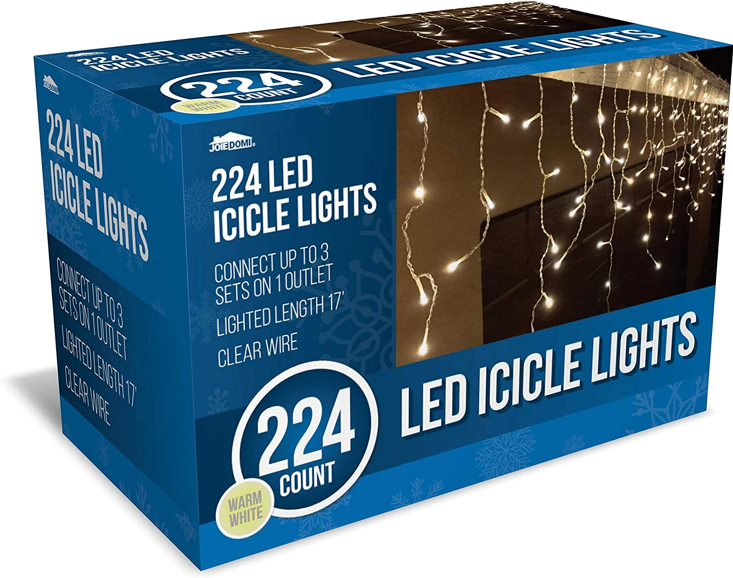 - SUPER VALUE. Joiedomi LED Icicle Christmas Lights has 224 bright Cold White LED bulbs with clear wire and can connect to up to 3 sets on 1 outlet. Lighted length of 17 Feet. Features 8 lighting modes. Low Voltage.