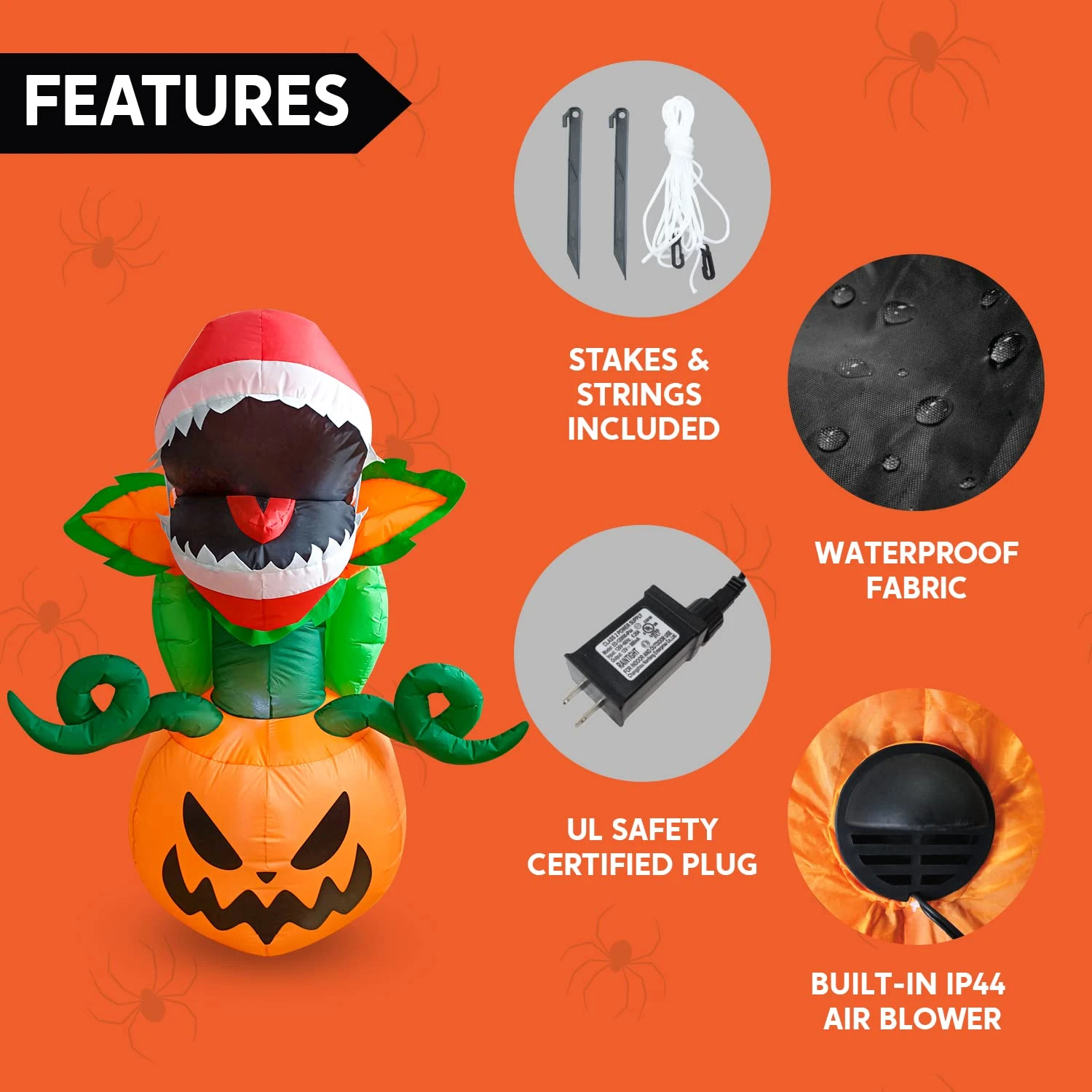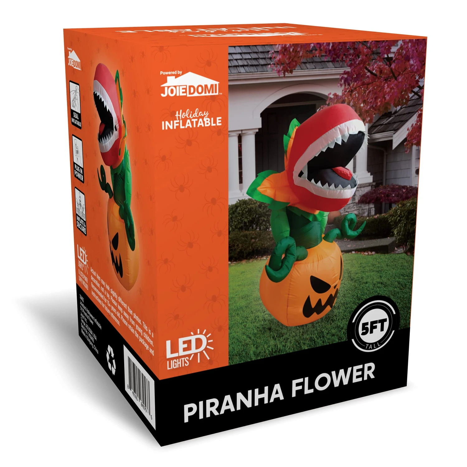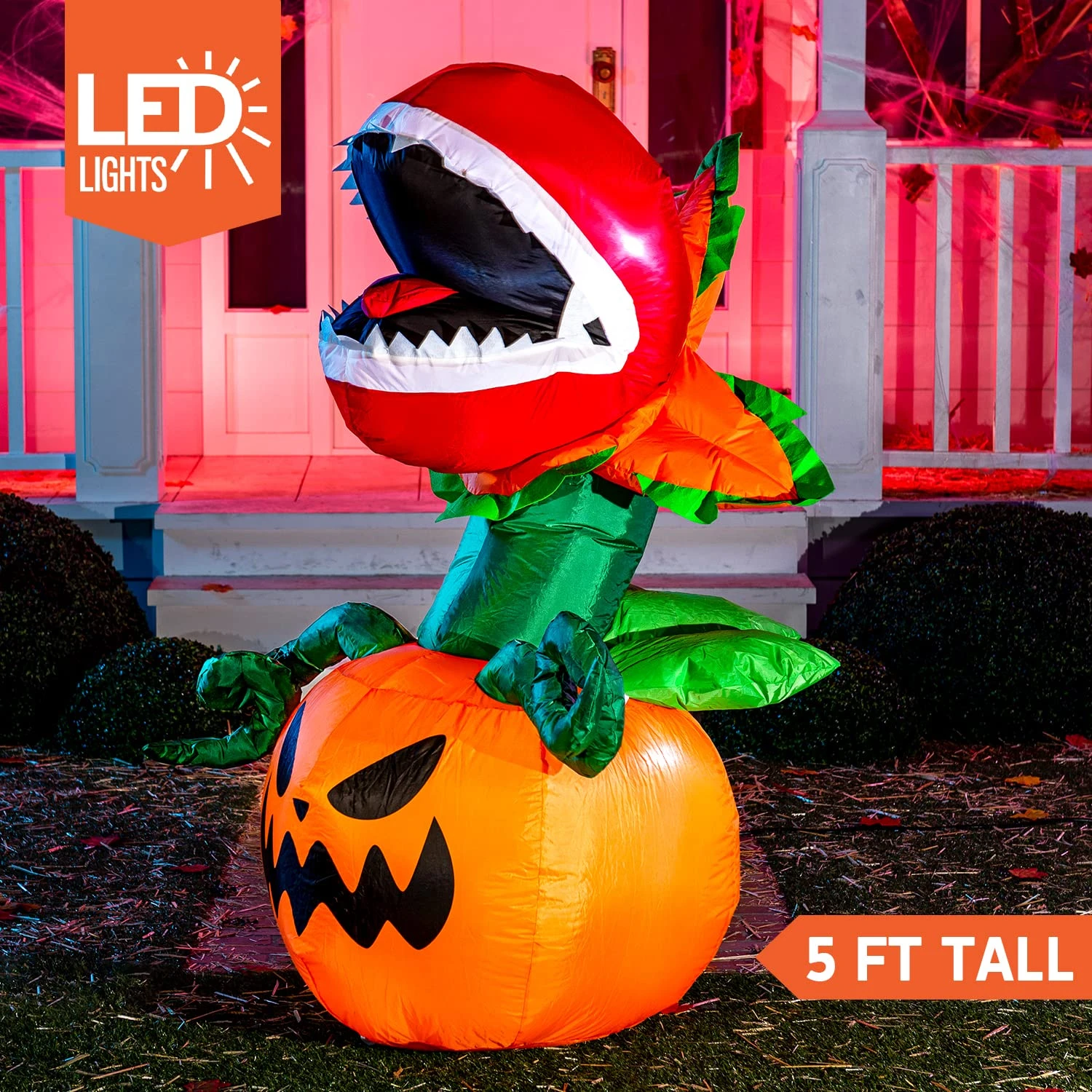 - Our 5 feet tall piranha flower halloween inflatable comes with extended cords, ground stakes, fastened ropes, built-in sandbags, and a plug with UL certification.