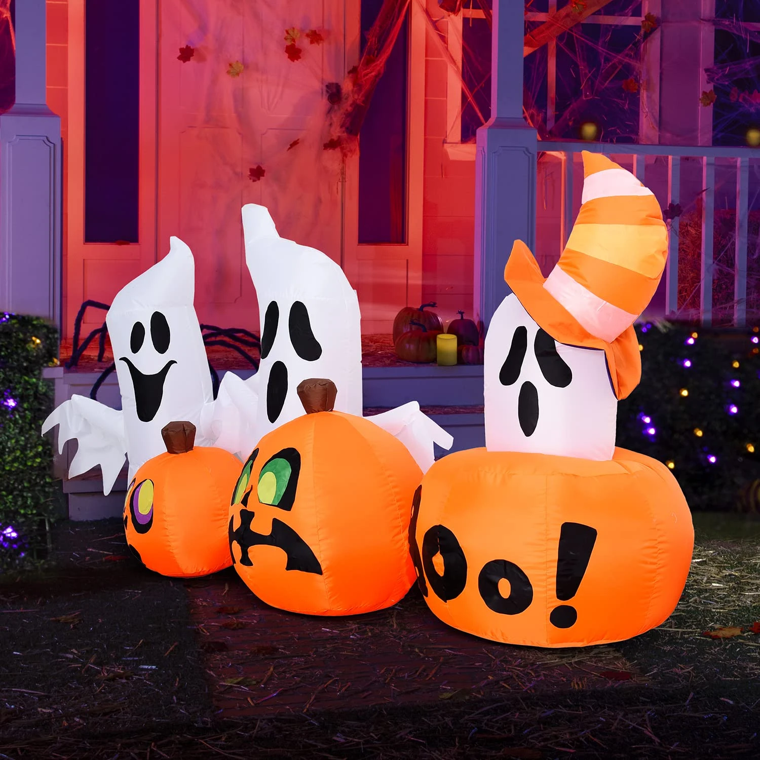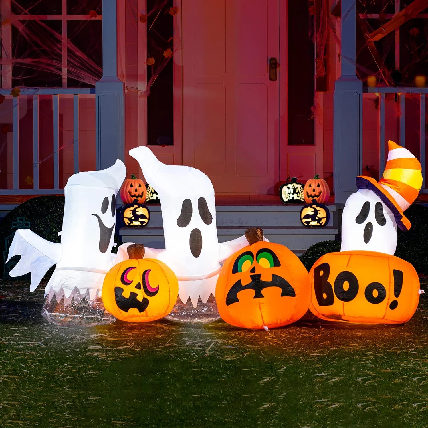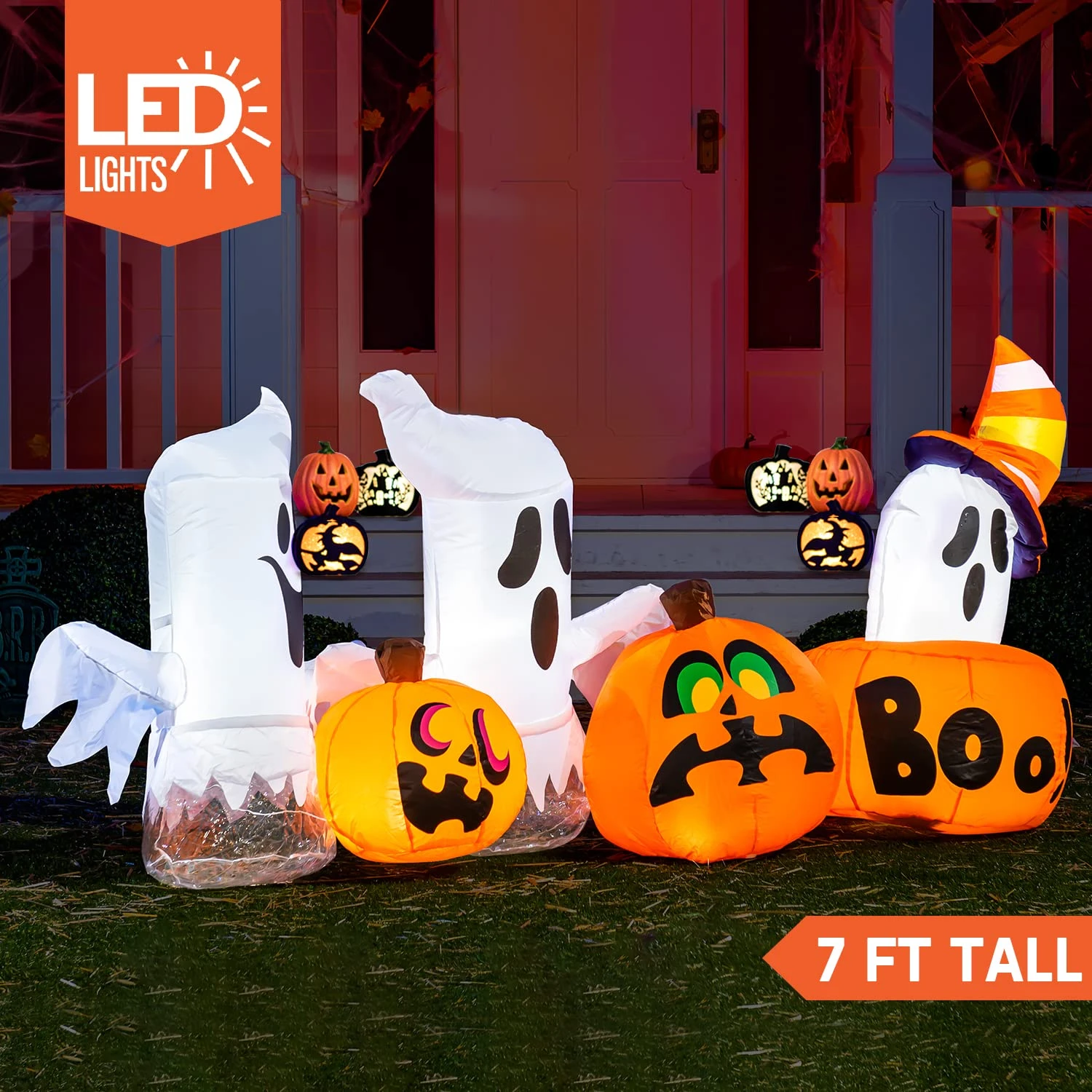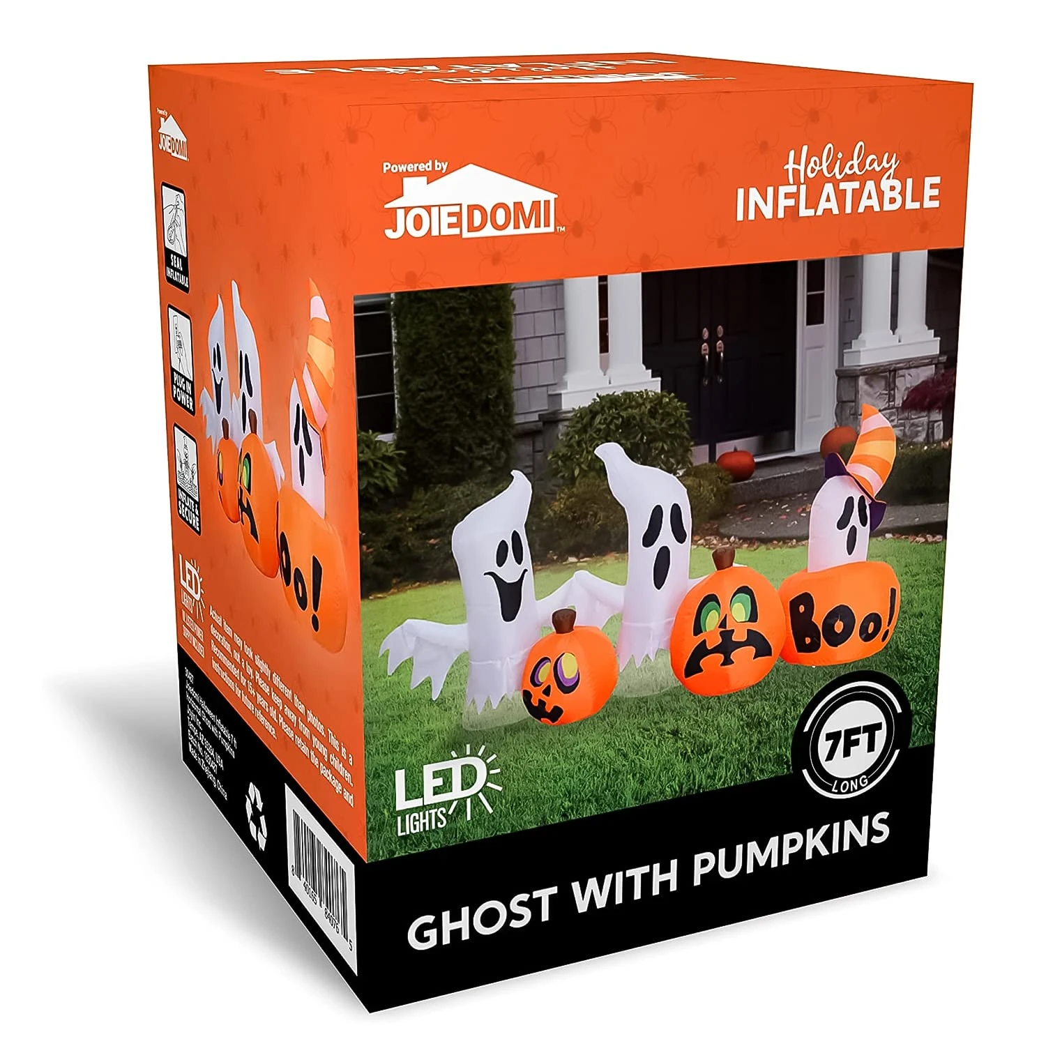 - Our 7 feet long horizontal ghost with pumpkins inflatable comes with extended cords, ground stakes, fastened ropes, built-in sandbags, and a plug with UL certification.
