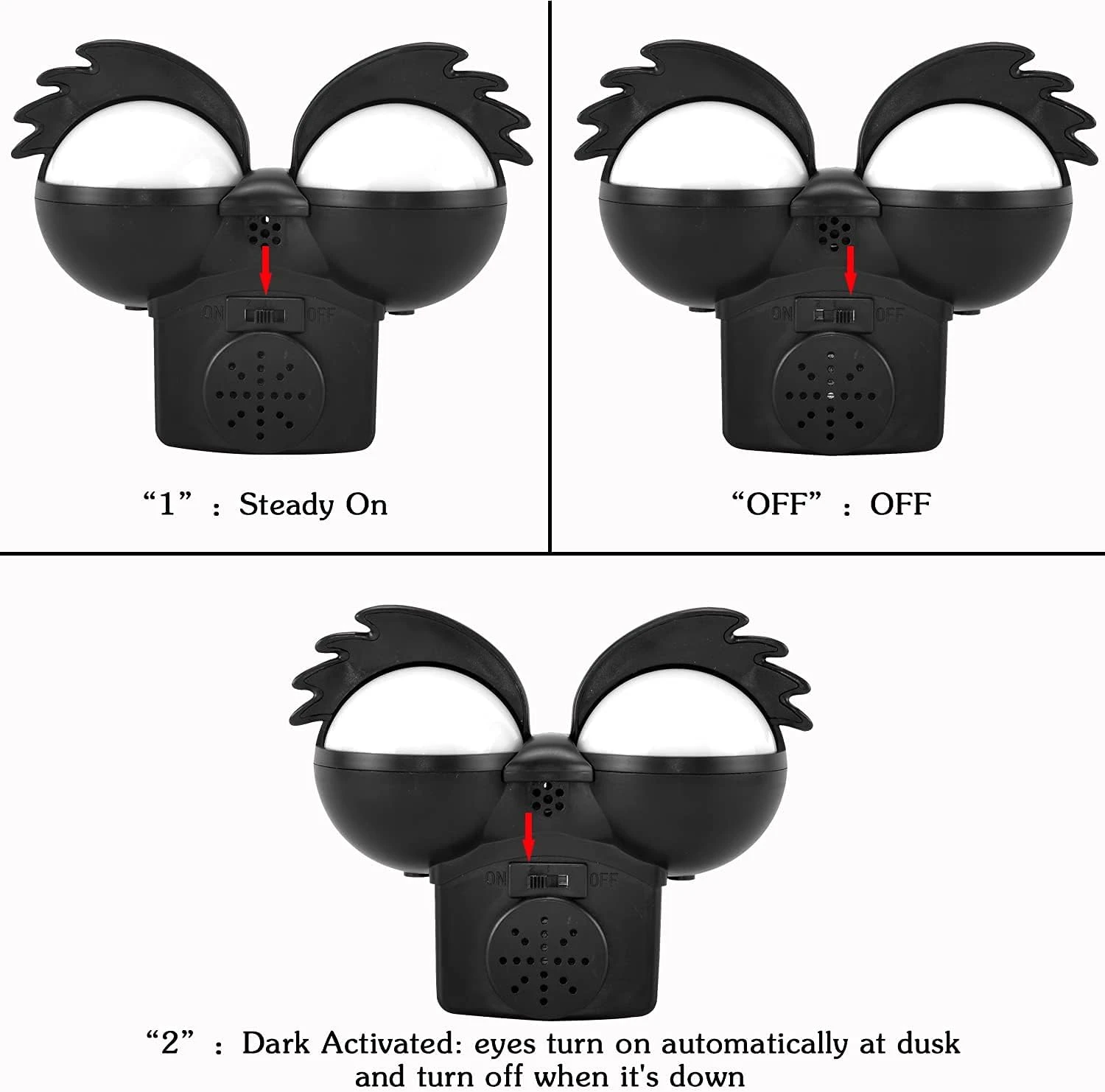 - Dark Activated: eyes turn on automatically at dusk and turn off when it‘ s down.