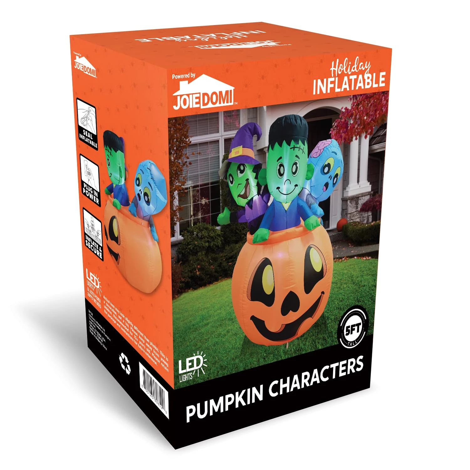 - Our 5 Feet tall three characters on pumpkin inflatable come with an extended cord, ground stakes, fastened ropes, built-in sandbags, and a plug with UL certification.