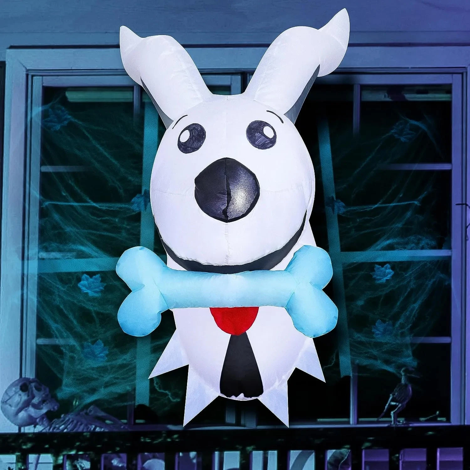 Excellent Design: The 3.5ft Dog Ghost Window Breaker Halloween Inflatable Decoration boasts an exceptional design that is both novel and cute. With its playful expression, long ears, and a blue bone in its mouth, it brings a touch of whimsy and charm to your Halloween setup. This inflatable comes with an extended cord, suction cups, fastened ropes, built-in sandbags, and a plug with UL certification.