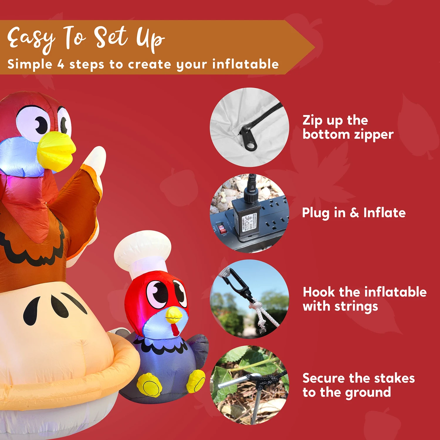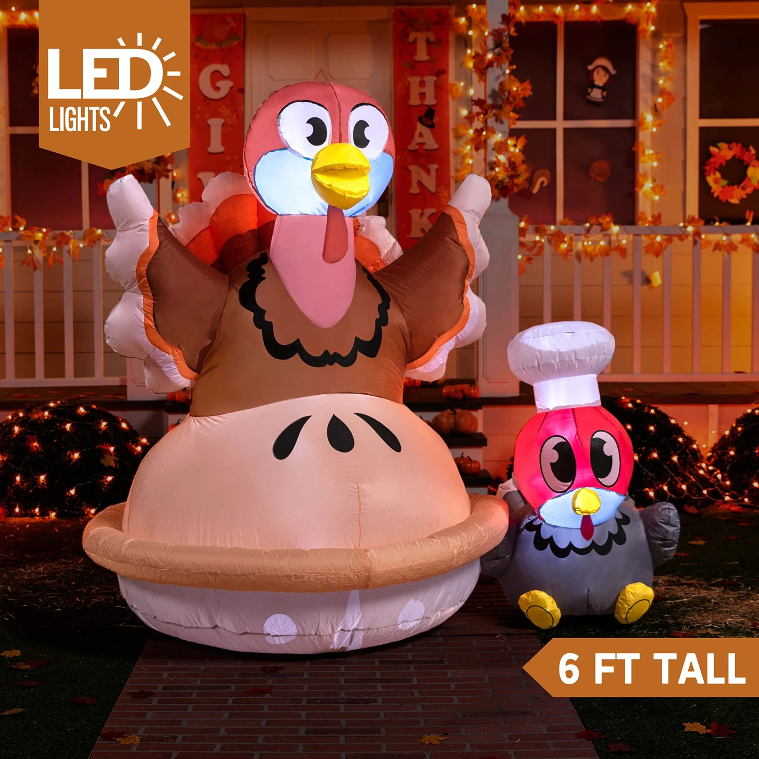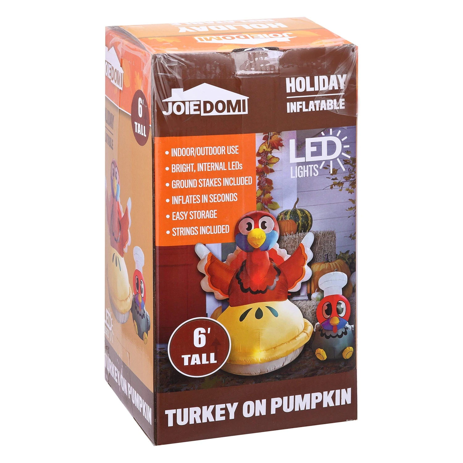 - 6 Feet Tall Turkey on a Pumpkin Pie Inflatable comes with an extended cord, ground stakes, fastened ropes, built-in sandbags, and a plug with UL certification.