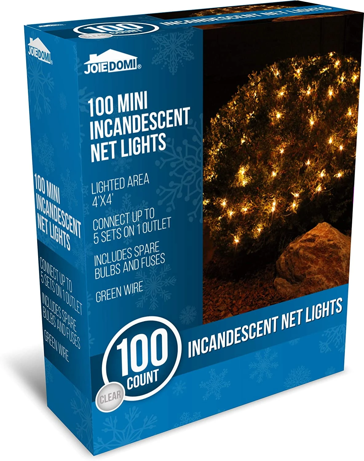 - SUPER VALUE PACK. Joiedomi Incandescent Net Christmas Mesh Lights features 100 bright Warm White mini incandescent bulbs with green wires, spare bulbs and fuses. Each set has the light area of 4 x 4 Feet. High Voltage.