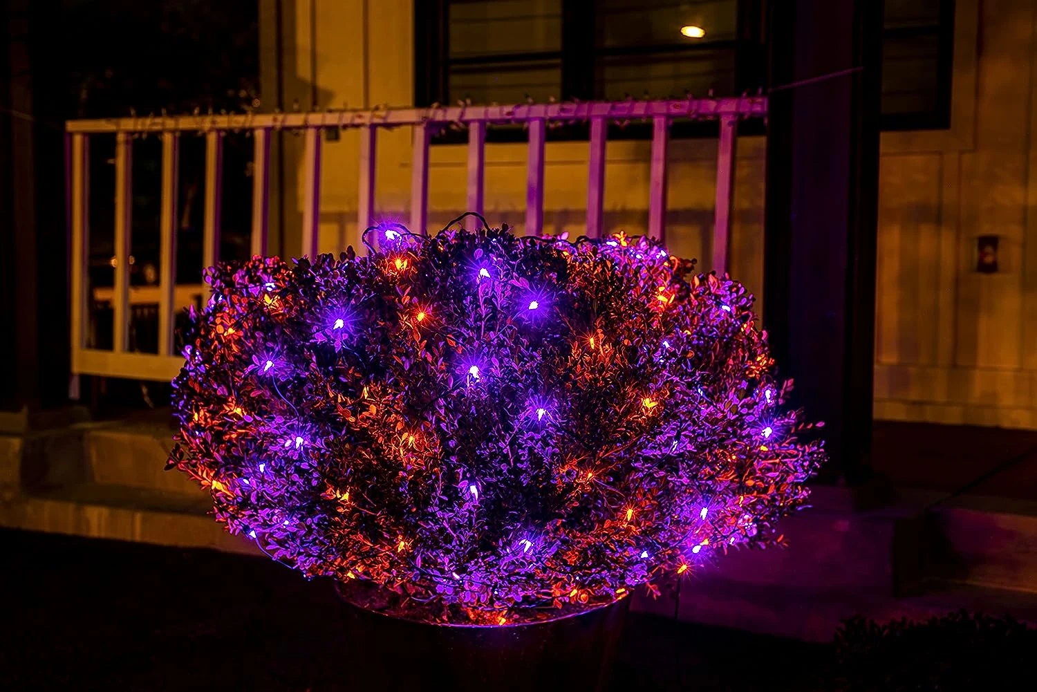 - Our Halloween LED Net Lights has a total of 100 LED Orange & Purple M5 Bulbs with Black Wire. 4.8W 120V. Lighted Area of 16 (4×4) Square Feet. High Voltage.