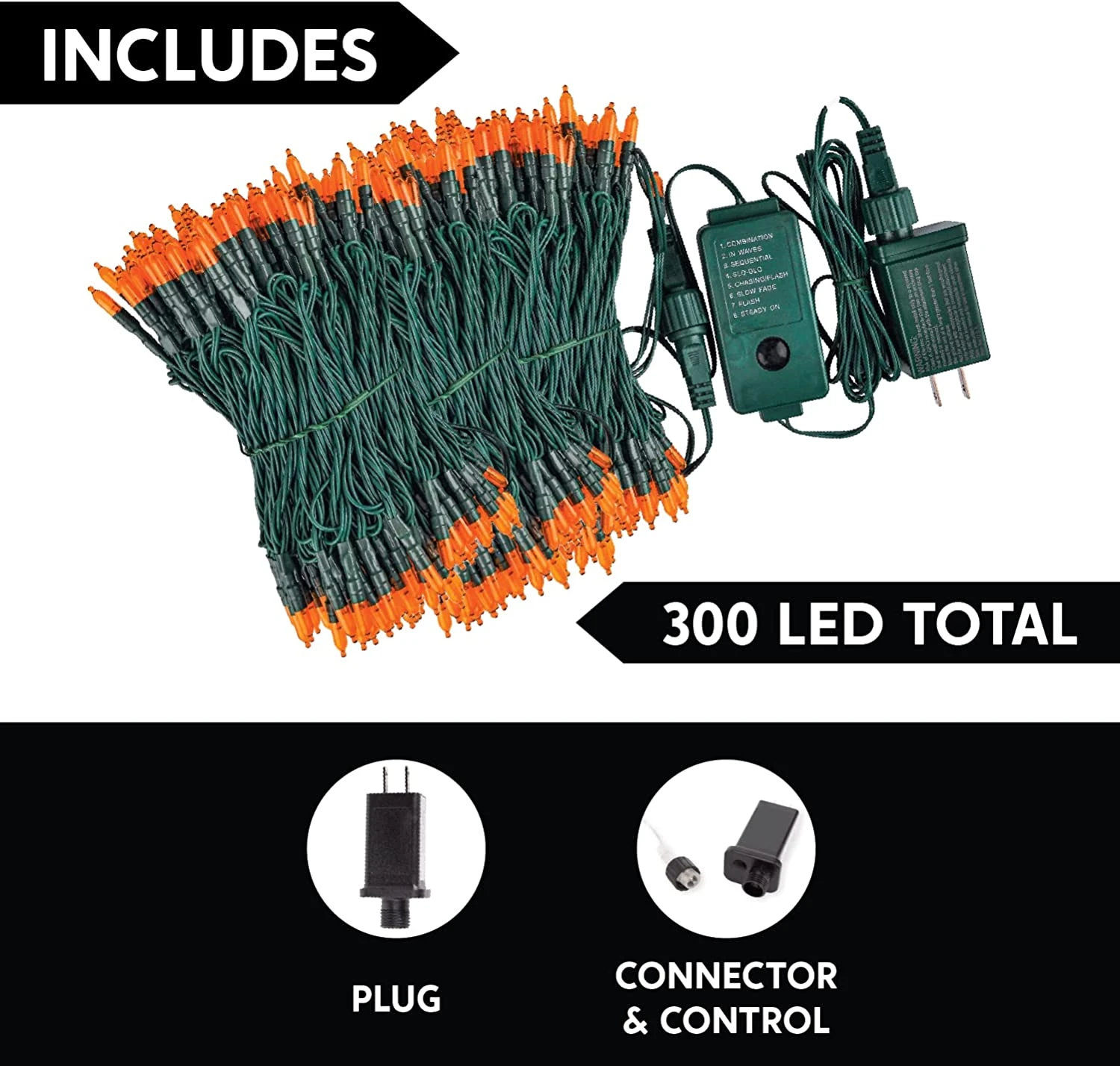 - GREAT HALLOWEEN DECORS: Our Halloween Lights include 300 Orange LED Green Wire String Lights with 8 Modes. Each set’s total length is 108.6 feet and 300 counts Orange LED has 3.93 inches spacing. The bulb’s height is 23mm.