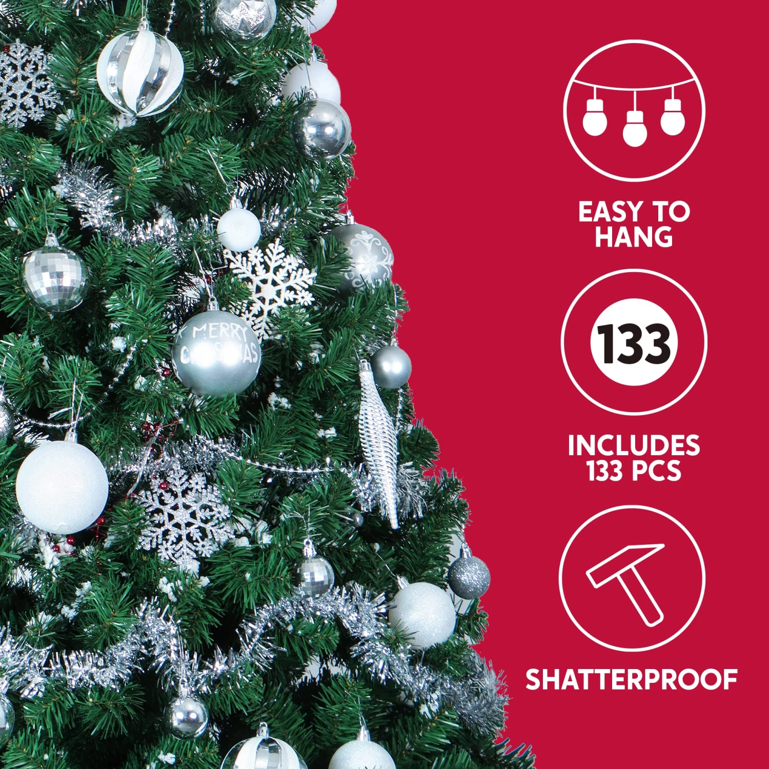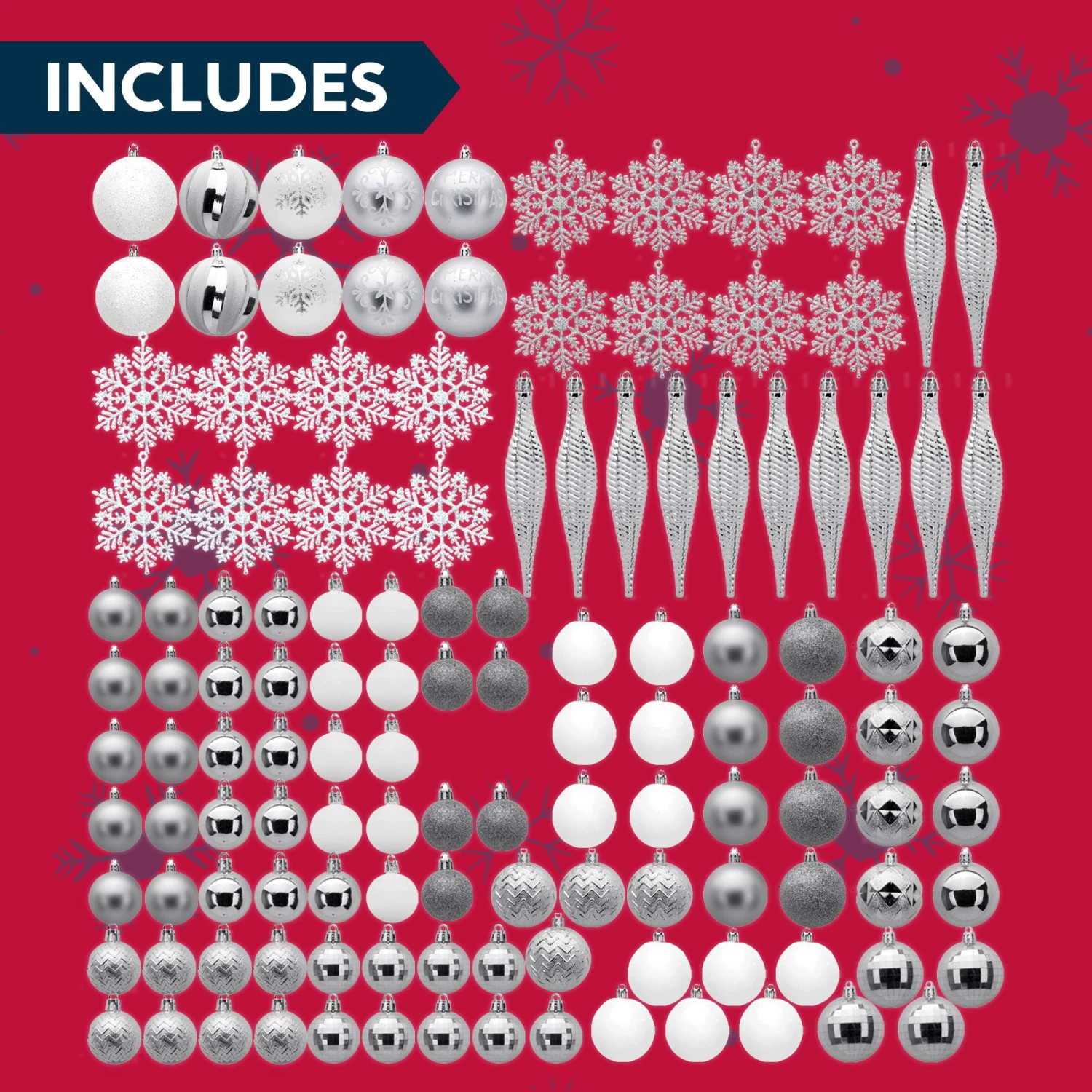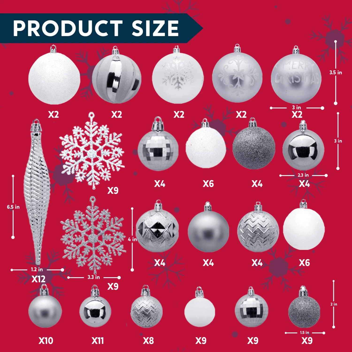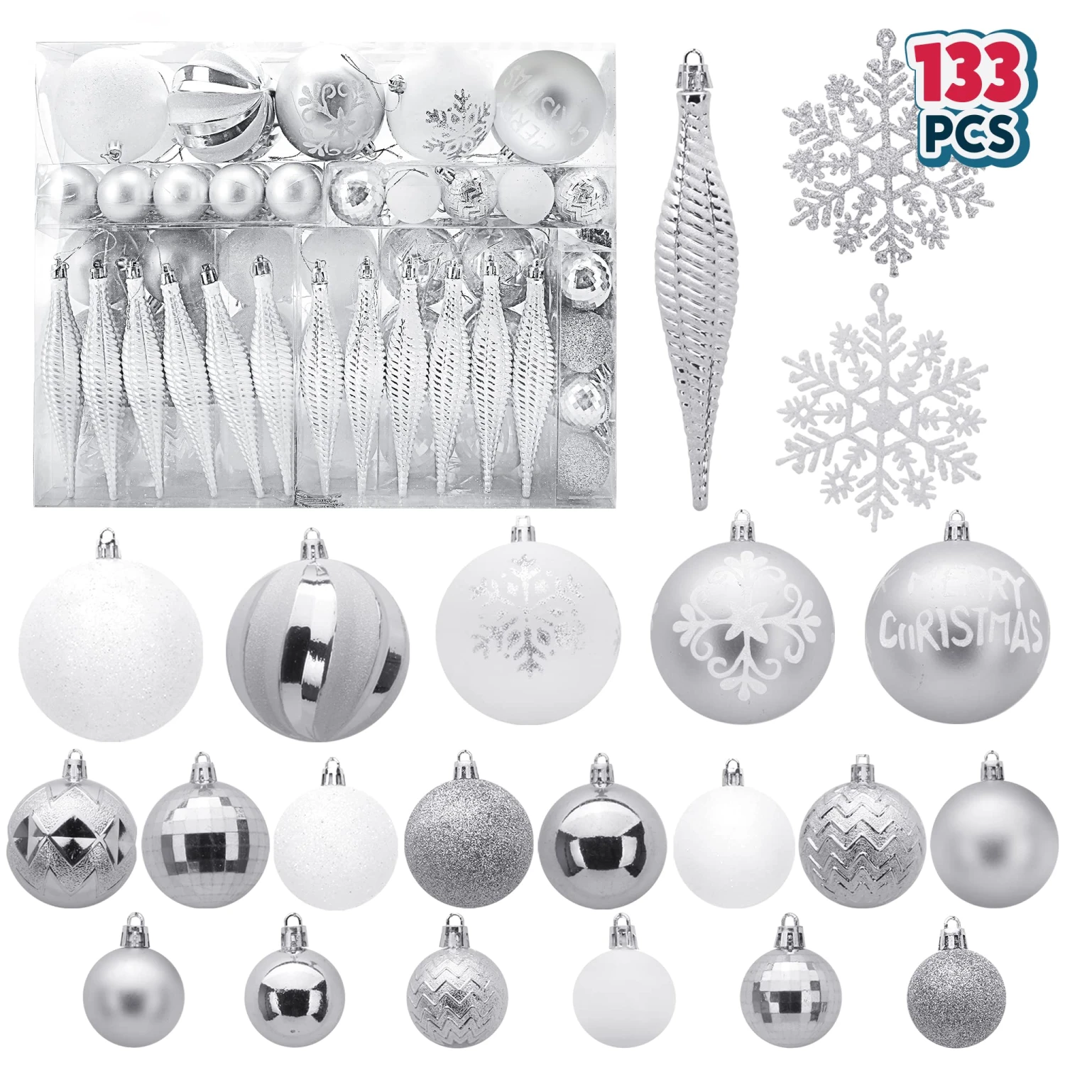 - Our fantastic silver & white Christmas decoration set includes 133 pcs assorted Christmas ball ornaments of 15 silver shiny balls, 15 white balls, 14 silver matte balls, 13 disco balls, 13 silver glitter balls, 12 stripes icicles, 12 zigzag balls, 10 silver snowflakes, 9 white snowflakes, 8 white glitter balls, 4 quilted balls, 2 swirl balls, 2 spirals balls, 2 snowflake balls, 2 Christmas tree balls. Measuring 1.57, 2.36, 3.15 inches.