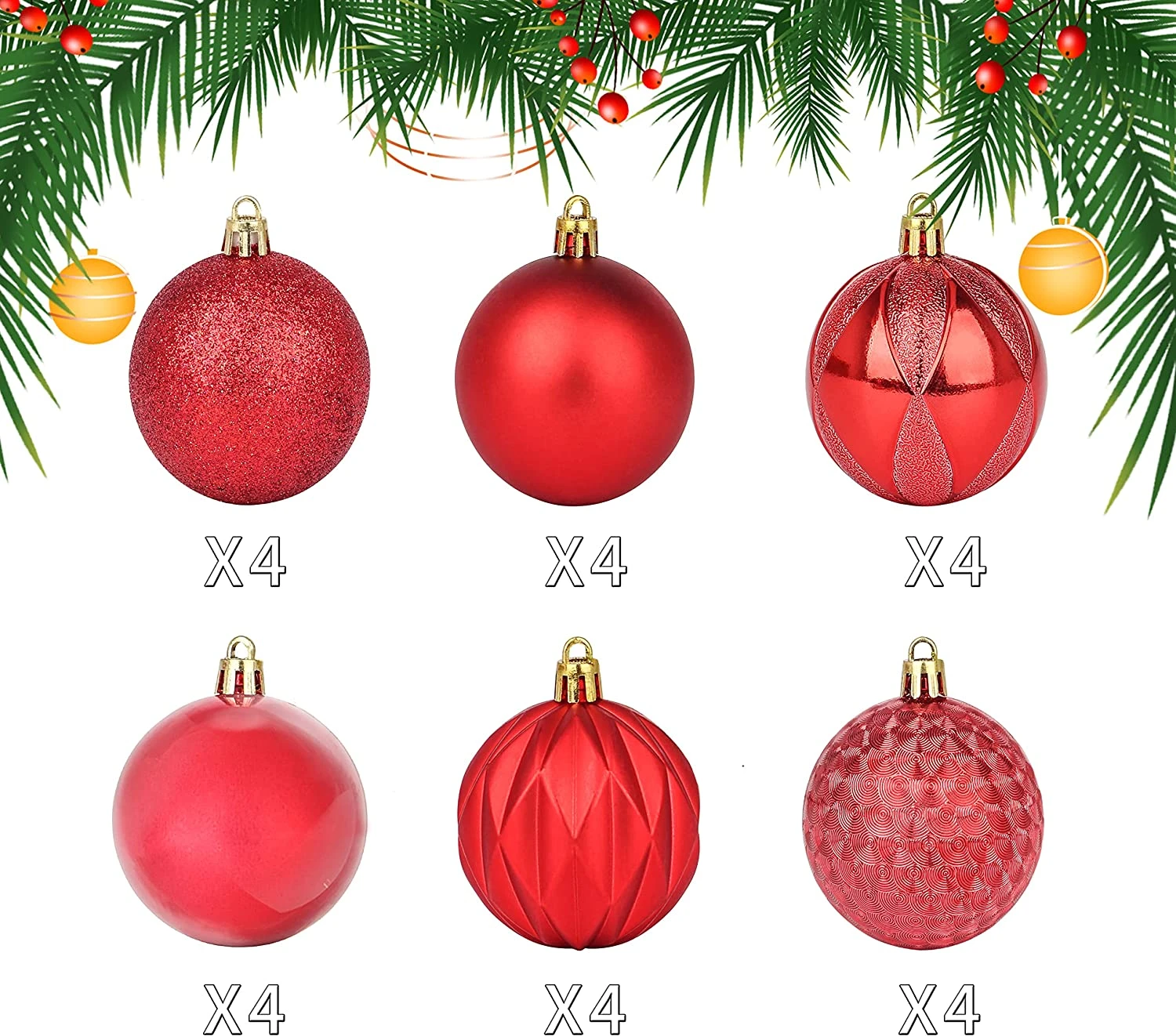 - Our fantastic christmas decorations include 4 glitter balls,4 matte balls,4 shiny balls,4 rhombus balls,4 shiny and matte balls,4 circle balls. Each color is bright and beautiful and perfect for Christmas indoor and outdoor decorations!