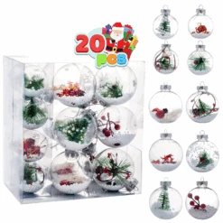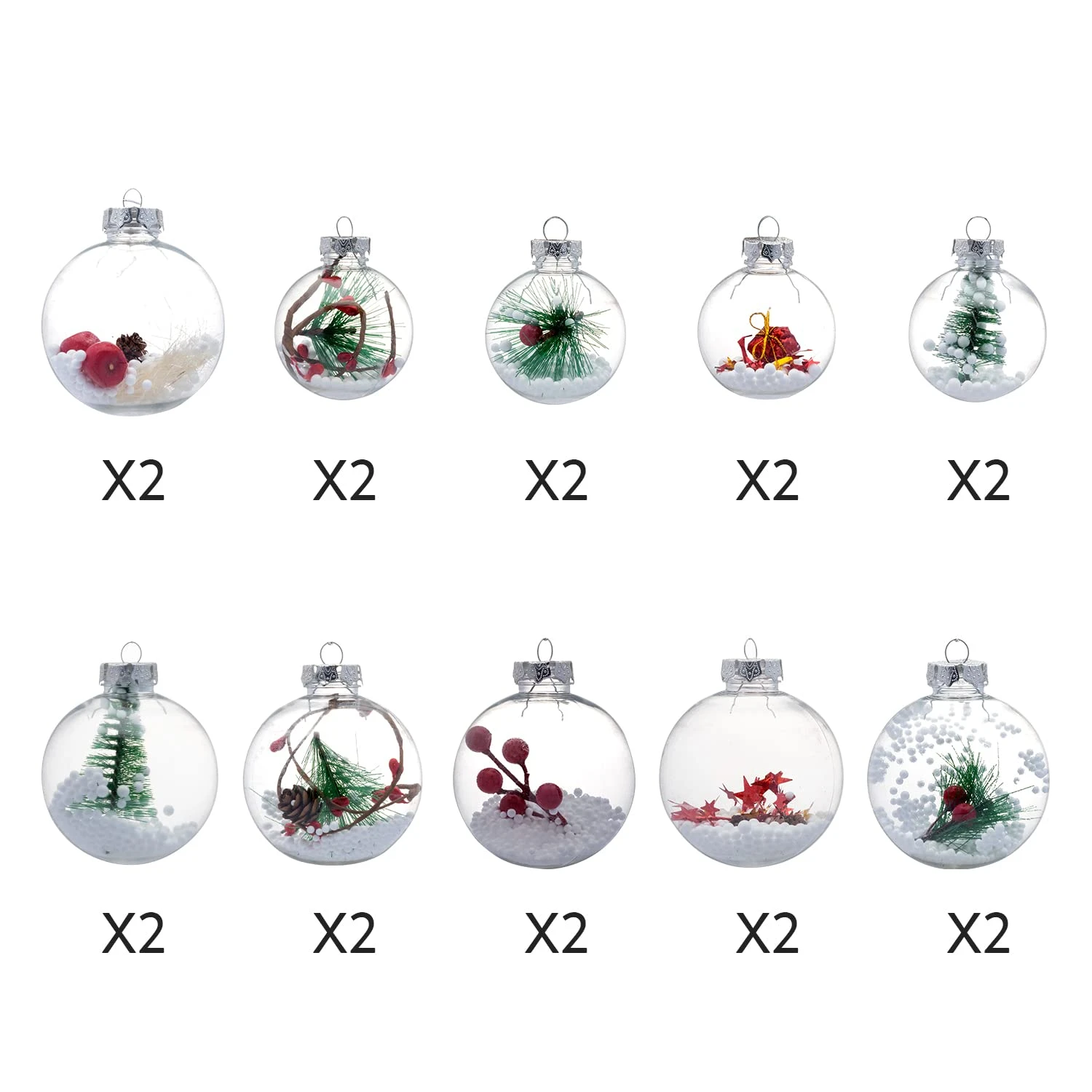- Our fantastic Christmas decorations include 20 pcs 3.5 inch and 8 pcs 2.5inch snow filling Christmas ball ornaments in clear plastic.