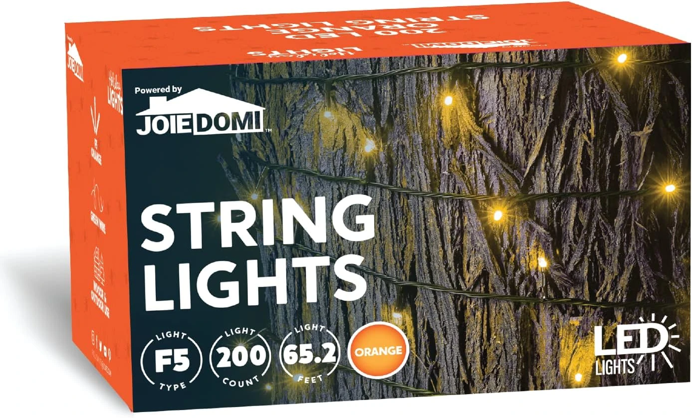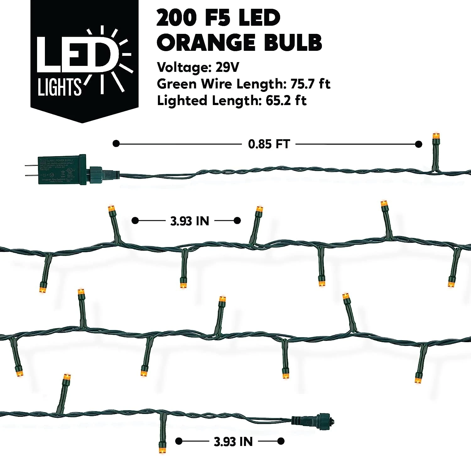 - Our Halloween LED String Lights has a total of 200 LED Orange F5 Bulbs with Green Wire. 29V. Total Lighted Length is 65.2 Feet. Total Wired Length is 75.7 Feet. Bulb Spacing 3.93 inches. Low Voltage.