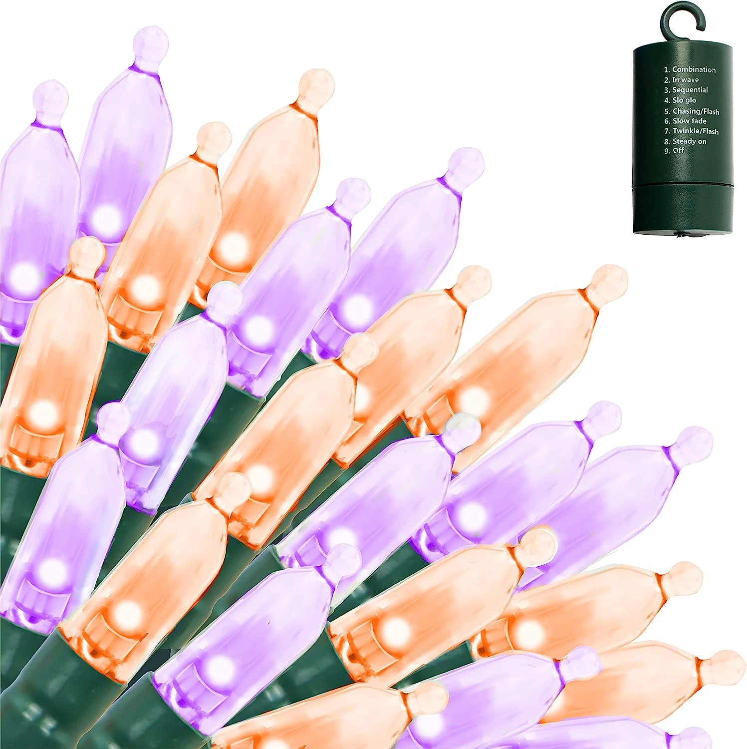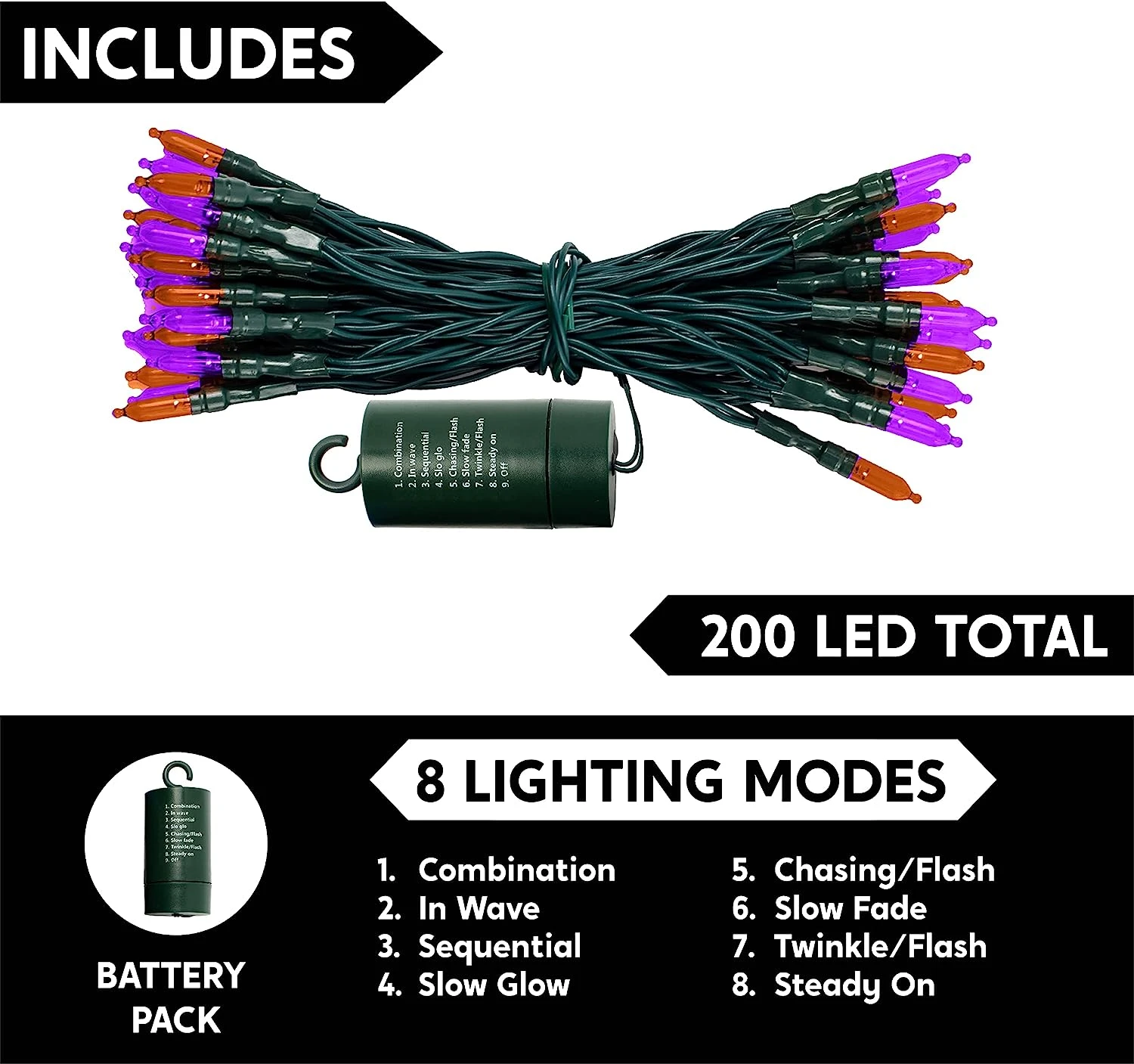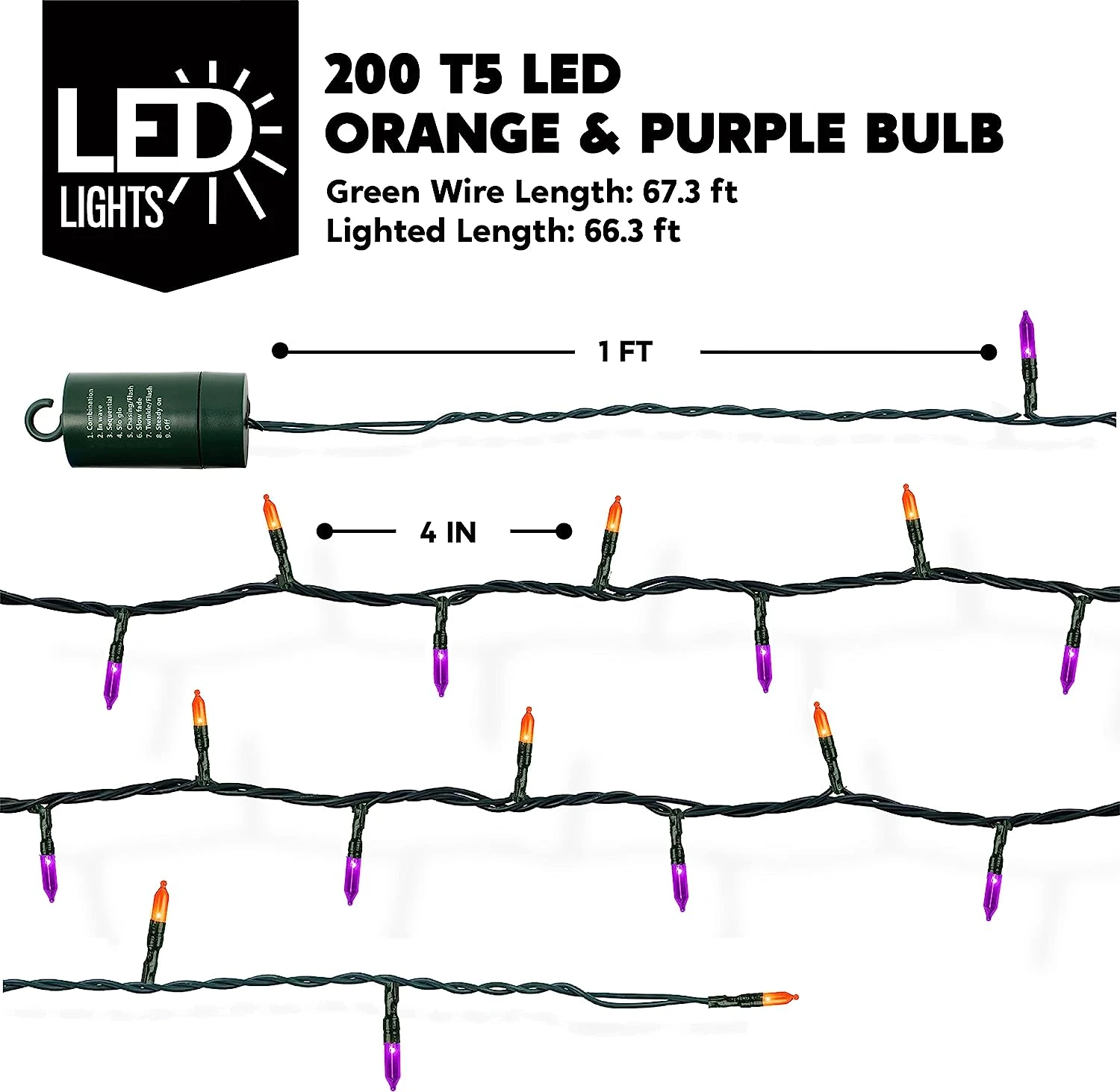 - Our string lights set includes 200 counts of Orange & Purple LED green wire string lights with 8 lighting modes. Each set is 67.3 feet long and has 4 inches spacing in between each bulb. The bulb’s size is 3 mm x 16 mm. These lights are battery powered, operated by remote control with a 6-hour timer.