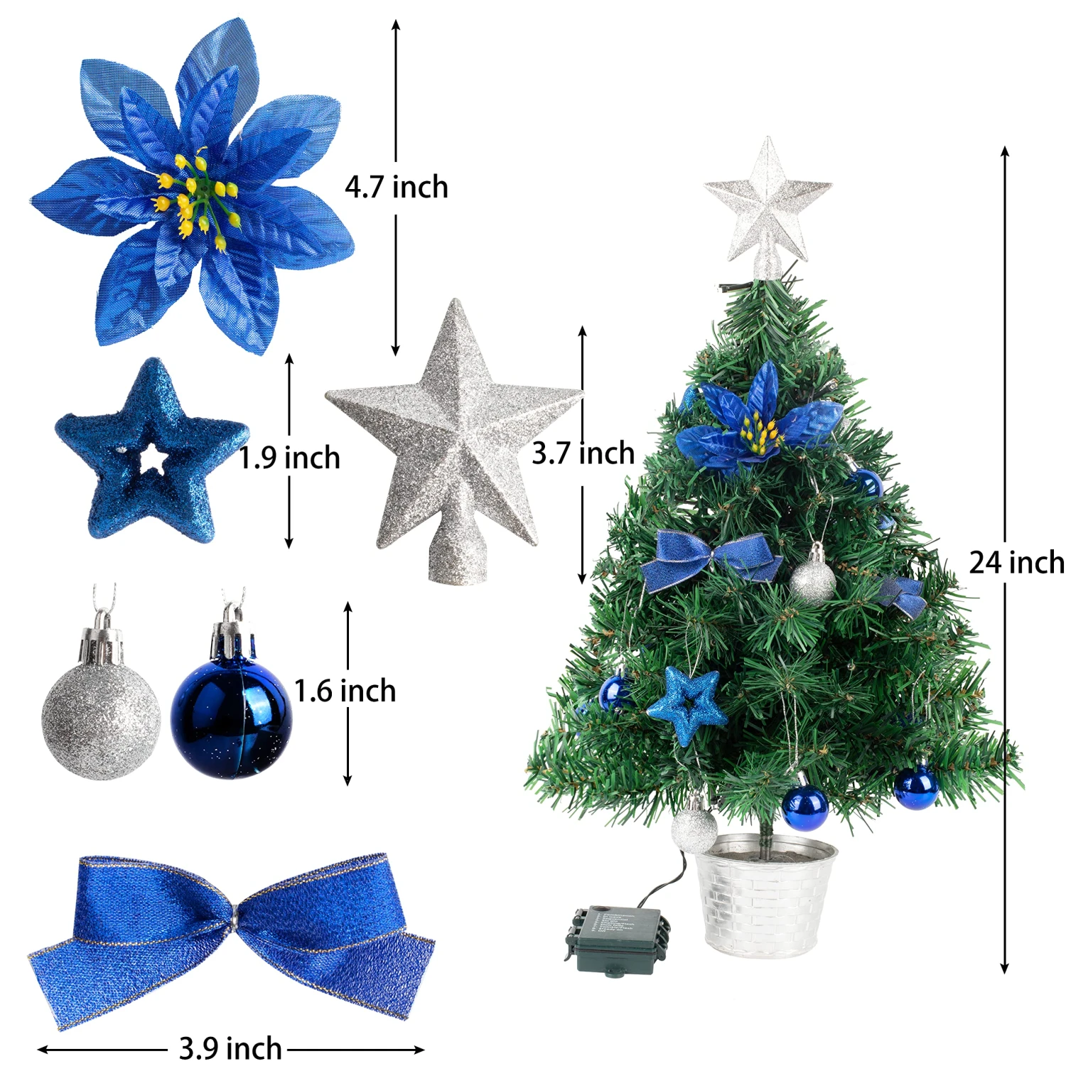 - Our decorative holiday tree includes 24 inches battery-powered tabletop mini Christmas tree with 50 LED warm white string lights. This comes with one treetop star,12 Christmas balls ornaments(6 blue and 6 silver),4 beautiful bows,3 five-pointed stars,3 beautiful flowers,1 sturdy silver flowerpot. Build your own Xmas tree and bring yourself a fun festive memory!