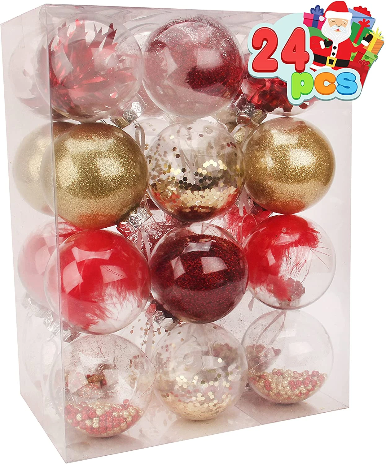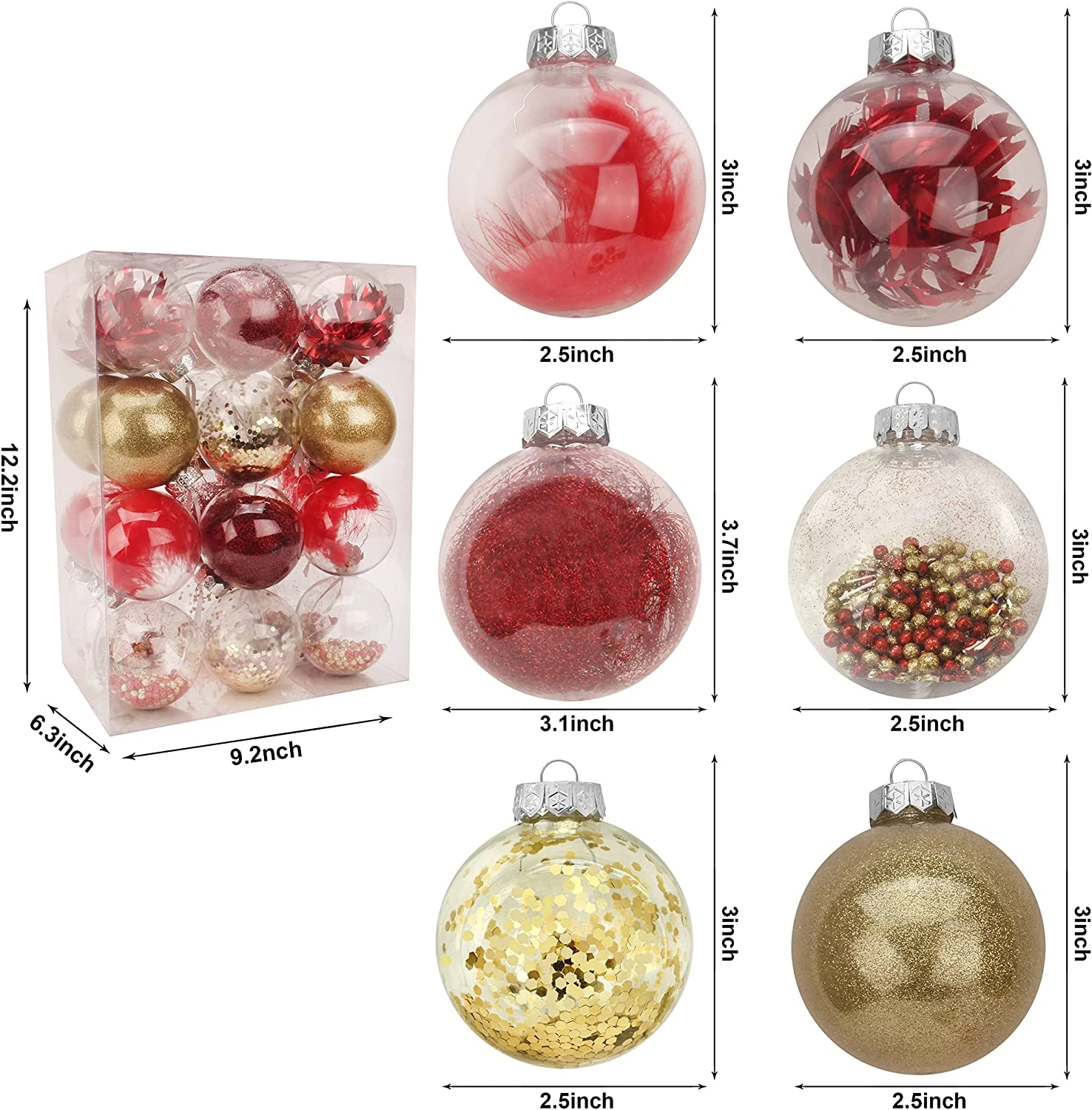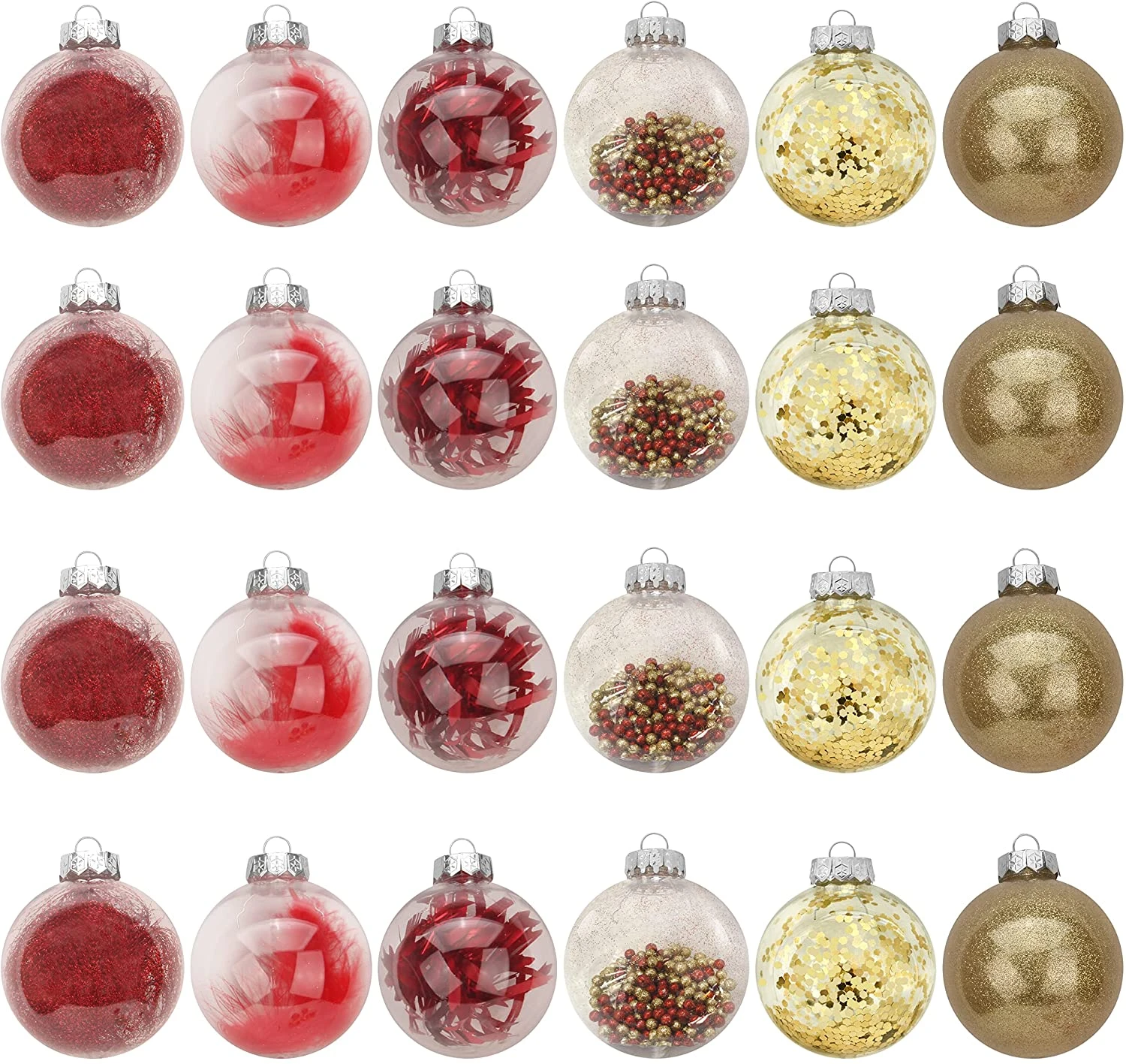 - Our fantastic Christmas decorations include 4 clear plastic balls with feathers, 4 clear plastic balls with metallic yarn, 4 clear plastic balls with shiny tinsel, 4 clear plastic balls with sequins, 4 clear plastic balls with particles, 4 clear plastic balls with glitter. Each color is bright and beautiful and perfect for Christmas indoor and outdoor decorations!