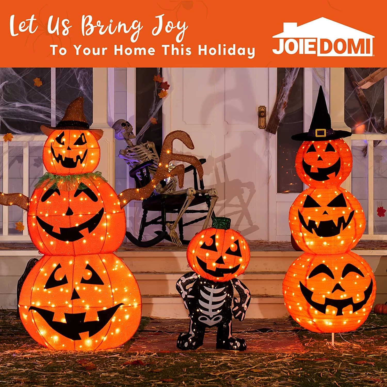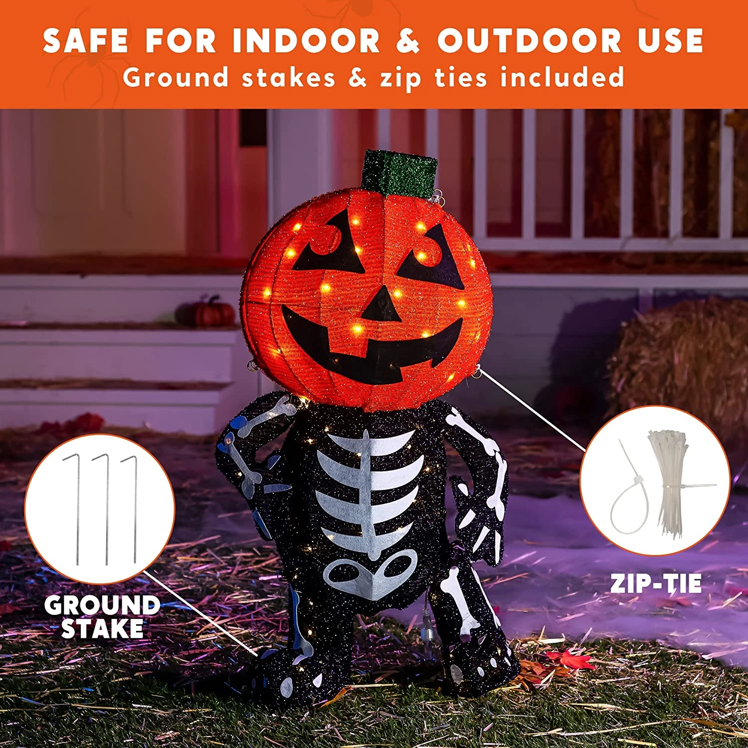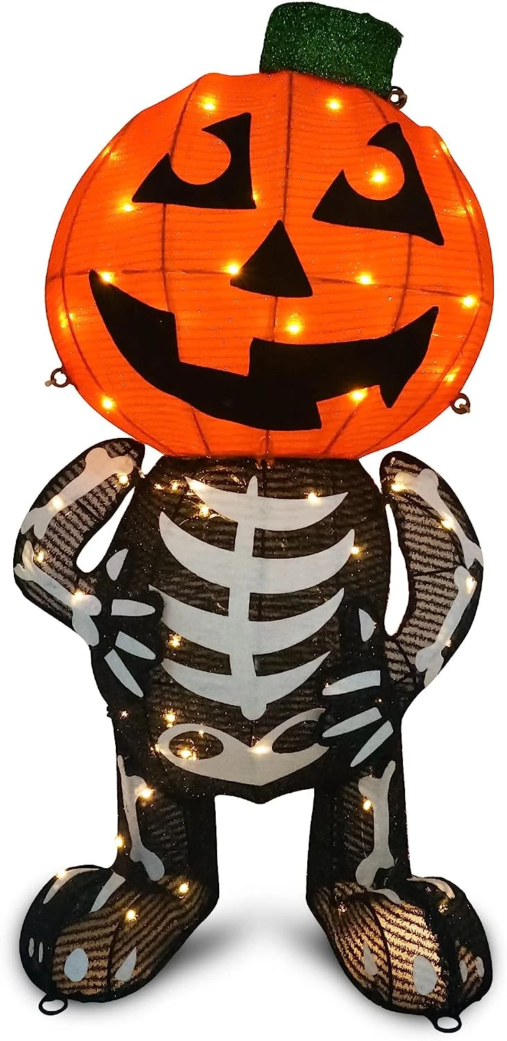 - Our Halloween LED Yard Lights include a 2.5 Feet Tall Skeleton Pumpkins with 60 LED Warm White Lights in Clear Wire, 4 Metal Stakes, and Zip Ties. Made of Metal Frame and Tinsel Fabric.