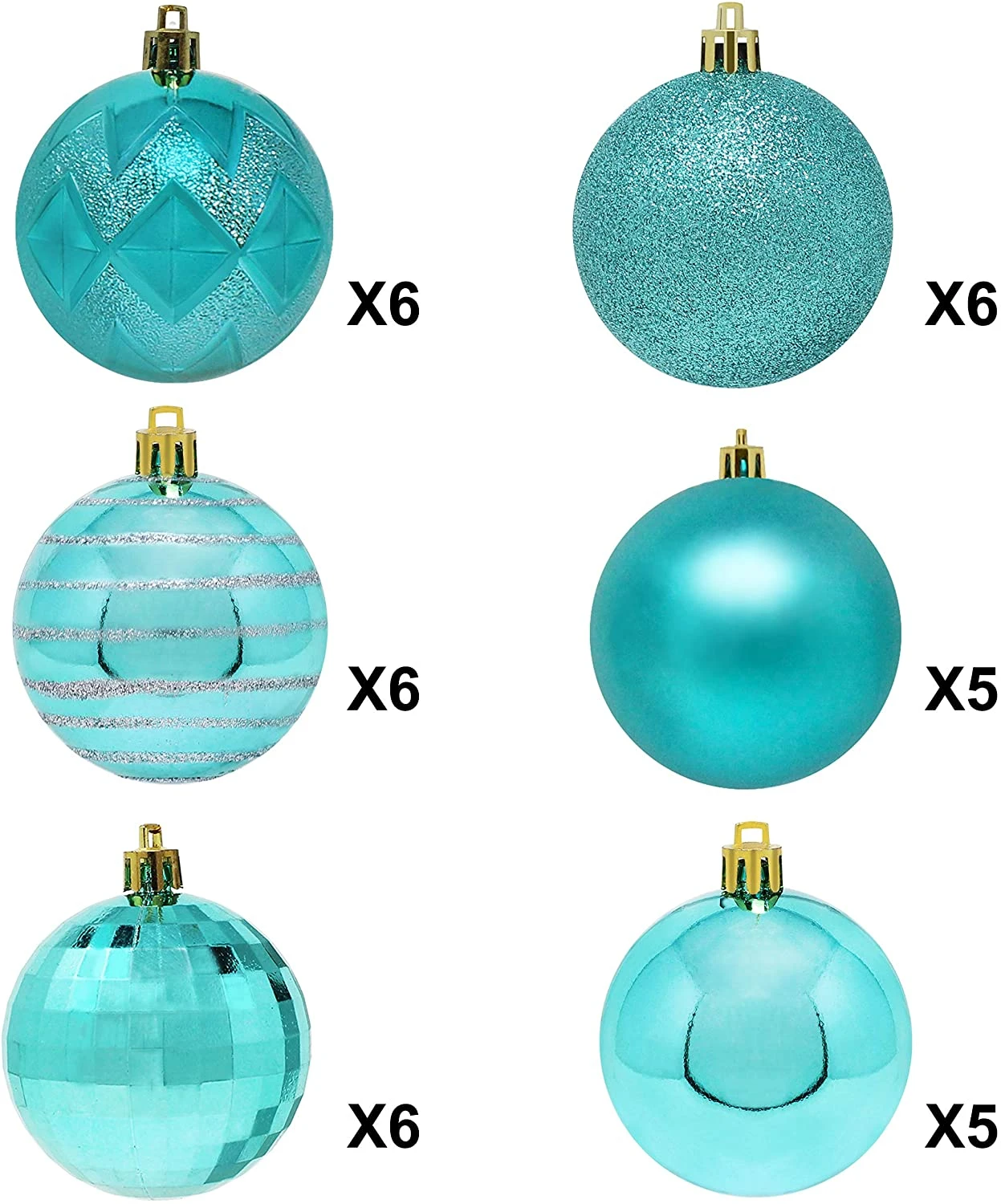 - SUPER VALUE PACK. Our Christmas Tree Ball Ornaments Set includes 6 Quilted Balls, 6 Stripes Balls, 6 Disco Balls, 6 Glitter Balls, 5 Matte Balls, 5 Shiny Balls.