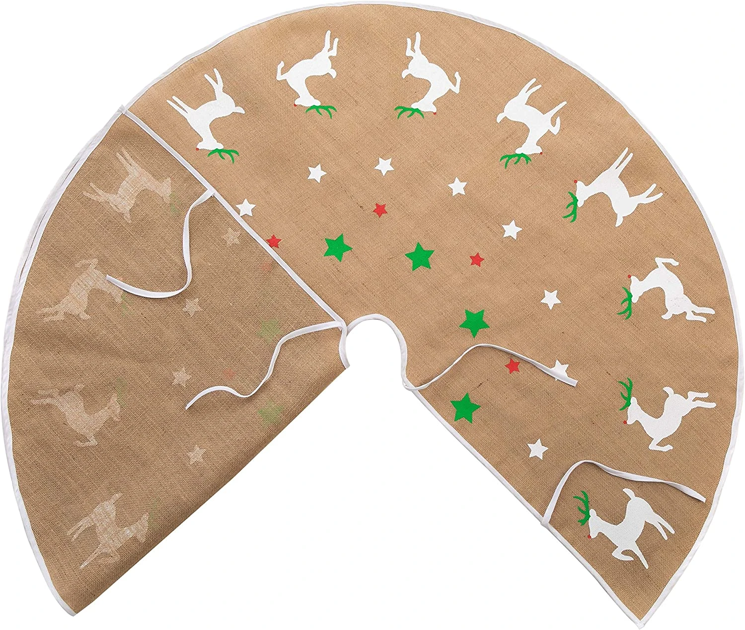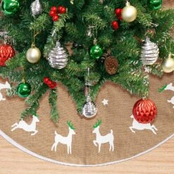 - REAL FUNCTION. Make your Christmas tree decor a little bit extra with our Burlap Christmas Tree Skirt. There are two ties at the opening that will allow you to secure Xmas tree skirt around the Christmas tree. Made with high quality materials for durability and lasting enjoyment. Perfect addition for your Christmas tree and add the best Christmas feeling to your home!