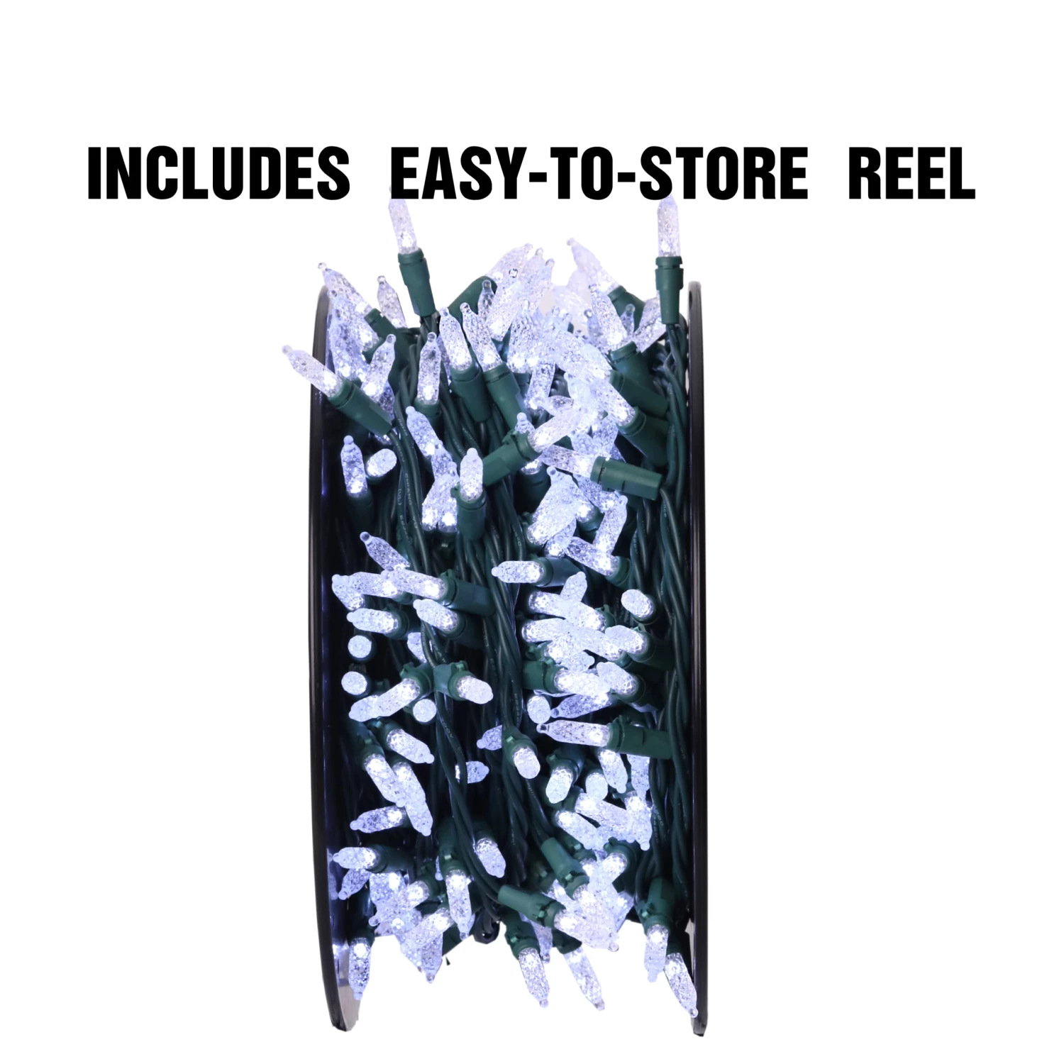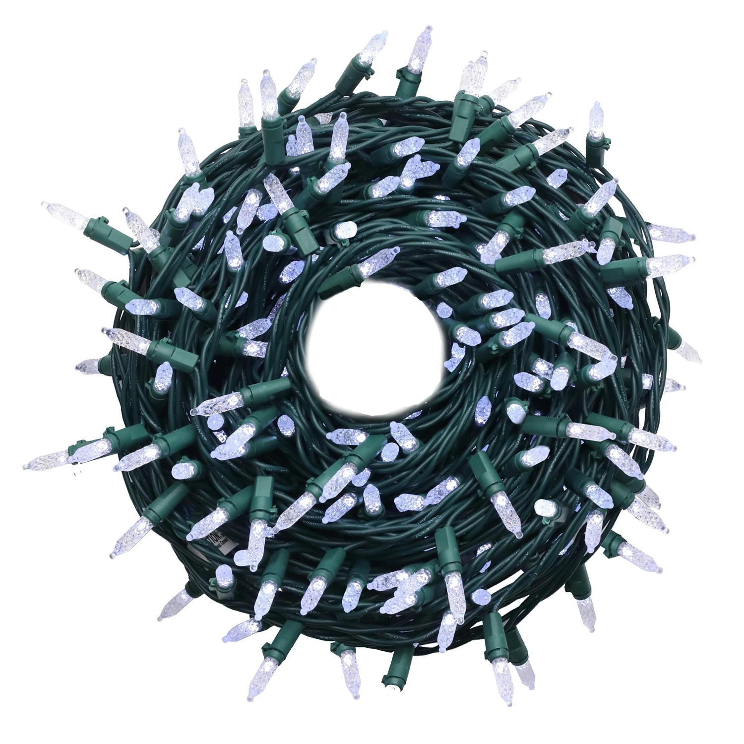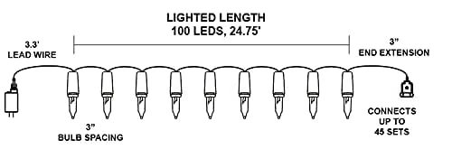- Our LED string Christmas lights have 100 bright cool white LED bulbs with green wire each. Lighted length of 24.75 feet each. Low voltage.