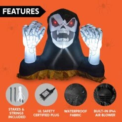 - Our 4 Feet tall Reaper Ground Breaker with hands Inflatable comes with extended cords, ground stakes, fastened ropes, built-in sandbags, and a plug with UL certification.