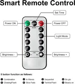 - Easy to operate. Equipped with a remote control to easily change the string lights lighting modes, the brightness of the led string (using the dim – or + button), or turn on/off the string lights. It has 8 modes such as combination, in a wave, sequential, slo glo, chasing/flash, slow fade, twinkle/flash, and steady on that can be selected at any time. Also got a 6hr timer feature that is convenient if you don’t have time to always check the lights