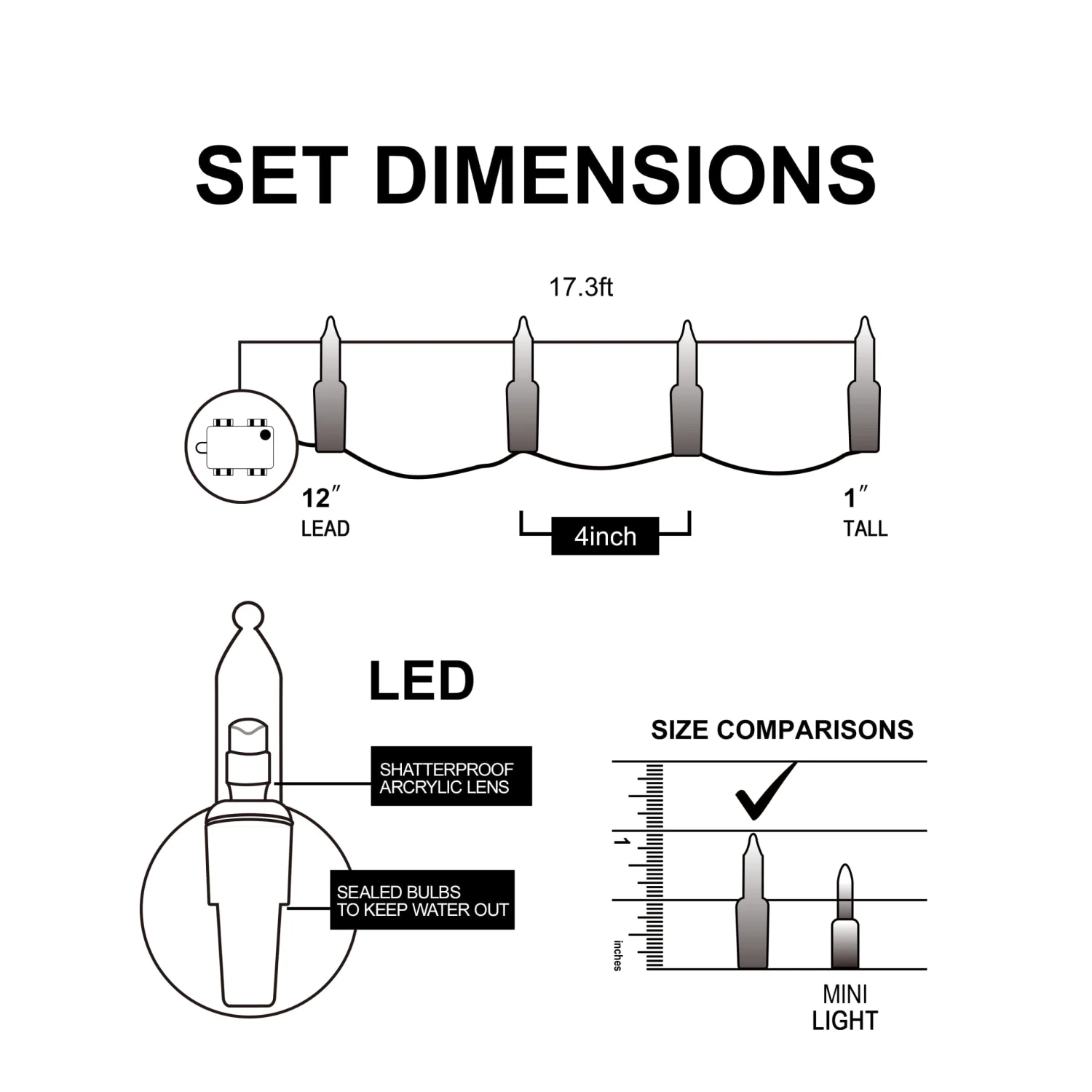 - This battery powered Christmas string light has 50 counts of Multicolor LED bulbs and measures at 17.3ft. The bulbs interval is at 4 inches and its individual size is 3mm*16mm.