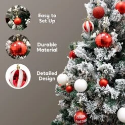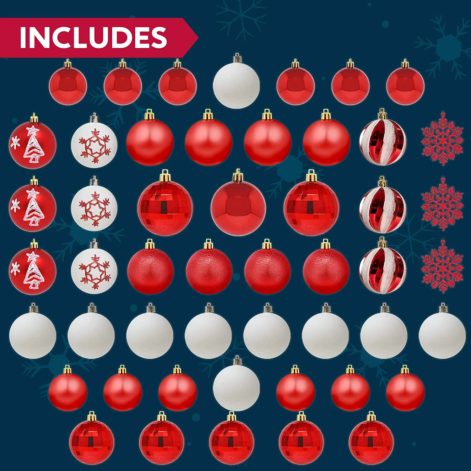 - SUPER VALUE PACK. Our Fantastic Red & White Christmas Decoration set includes 50 pcs Assorted Christmas Ball Ornaments of 10 Red Matte Balls, 10 White Balls, 7 Red Shiny Balls, 7 Disco Balls, 4 Glitter Balls, 3 Swirl Balls, 3 Hexagram Snowflake Balls, 3 Christmas Tree Balls, 3 Red Snowflakes. Perfect for indoor and outdoor decorations for this Christmas Season. Measuring 1.57, 2.36, 3.15 inches.