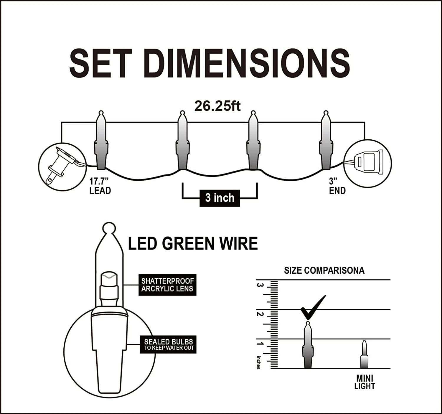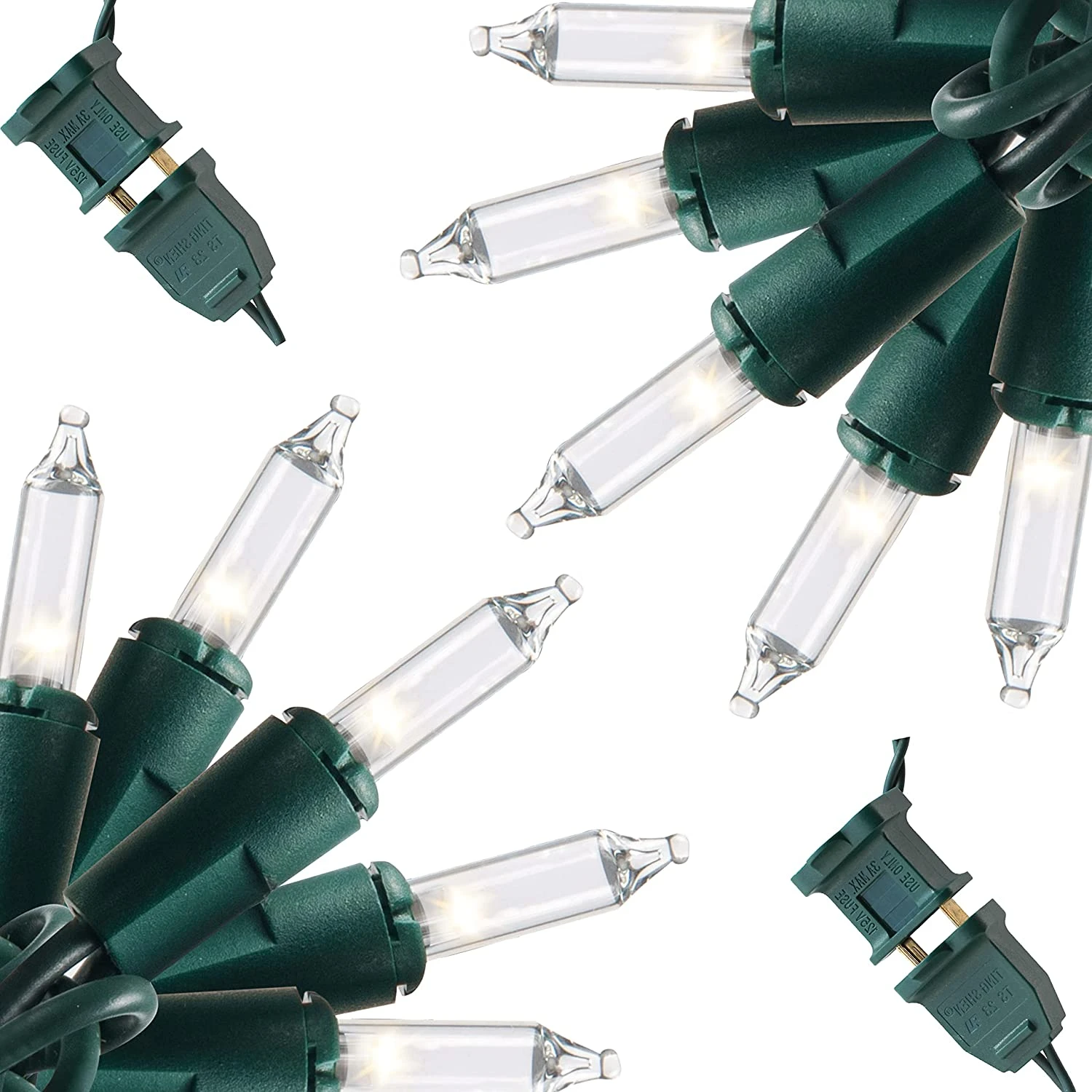 - Our 52.5 FT 200 Count Christmas Clear Green Wire. Conventional household power supply 120 volts 9.6 watts. 22 sets can be connected end to end with 4 extra bulbs 2 fuses included.