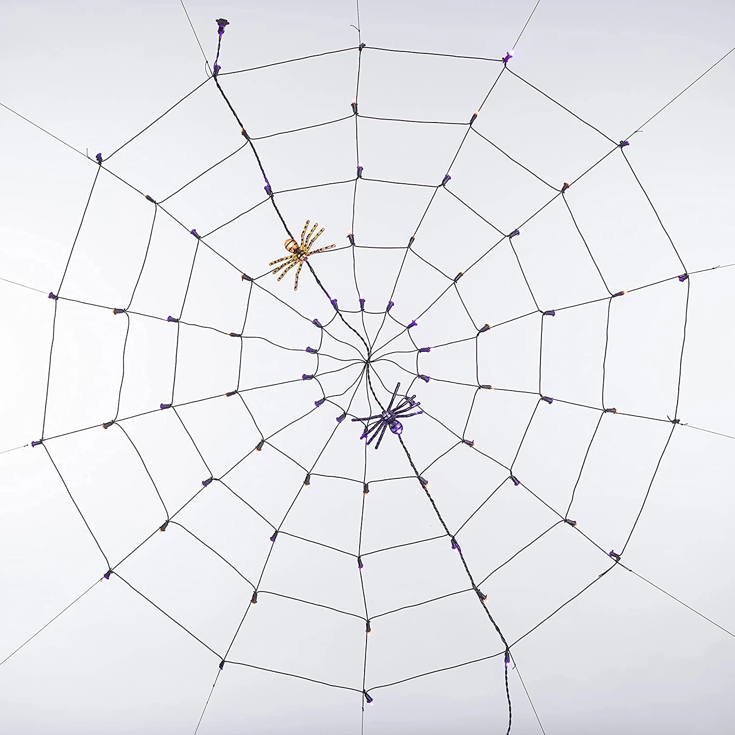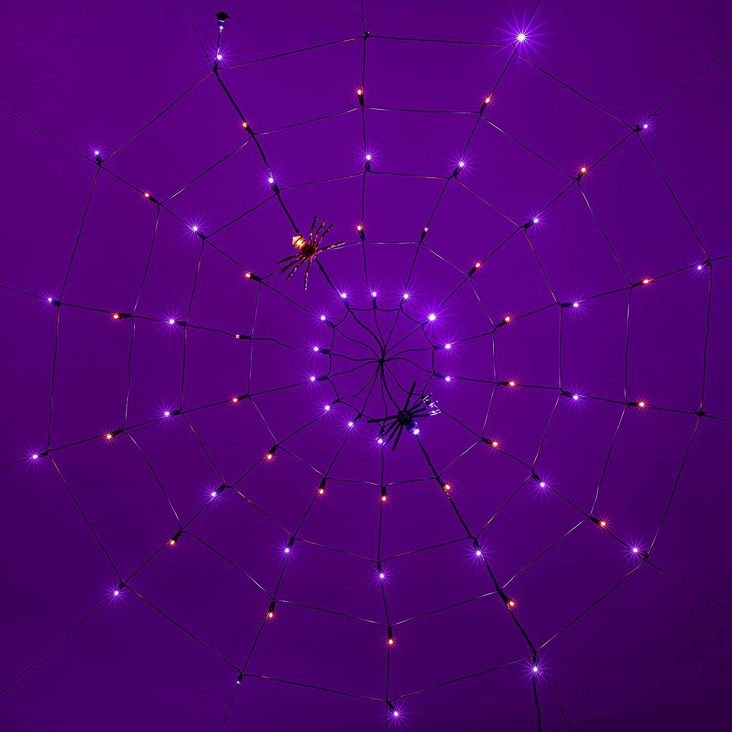 - Our Halloween Decor includes 1 pc Halloween Purple and Orange LED Light-up Spider Web with 2 fake spiders. 60 inches Spider Web, and vivid fake spiders! Attract and spook your neighbors!