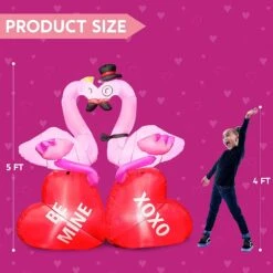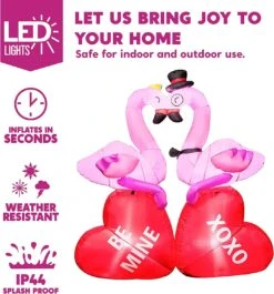 - Our 5 feet flamingos couple inflatable valentine comes with an extended cord, ground stakes, fastened ropes, built-in sandbags, built-in LED lights, and a plug with UL certification.
