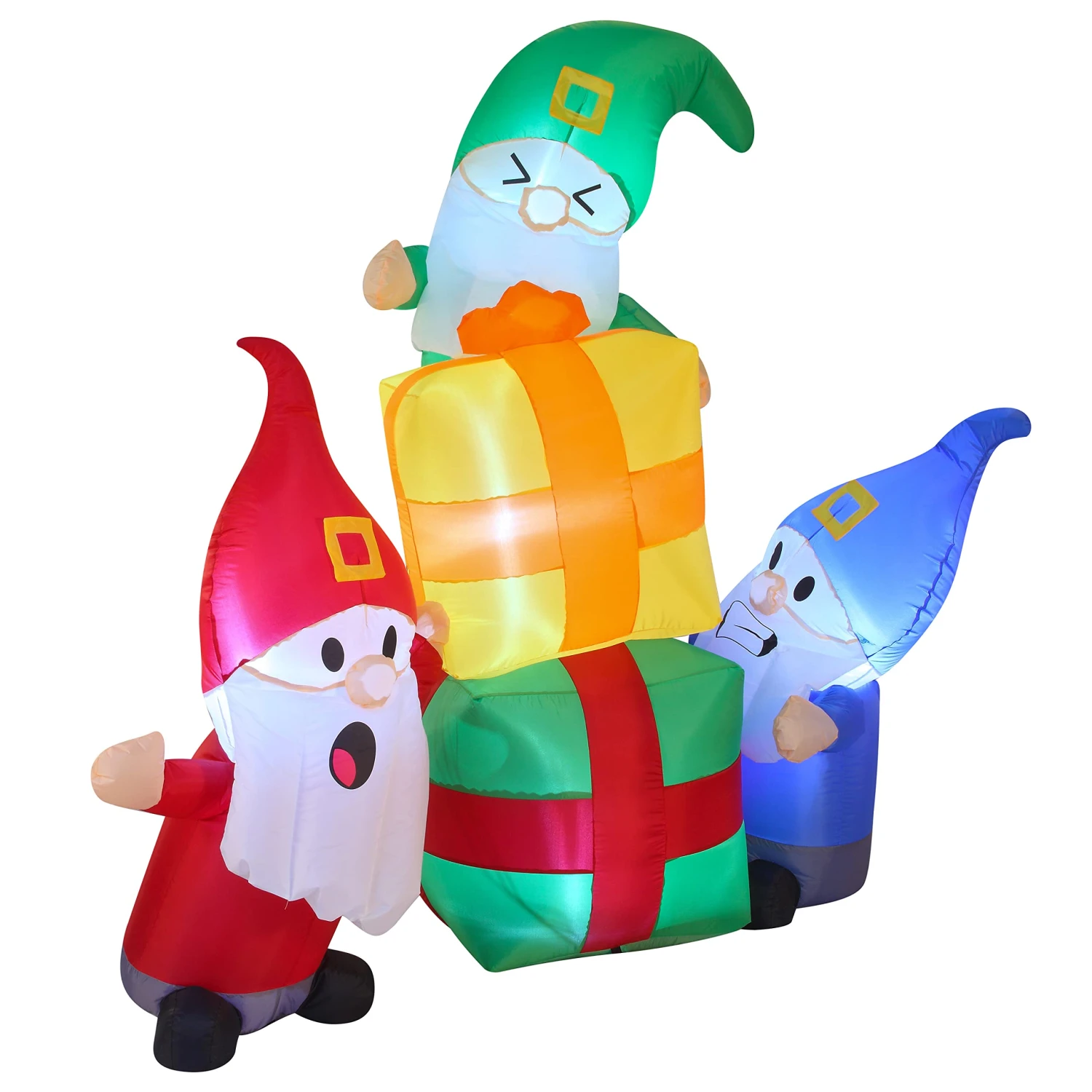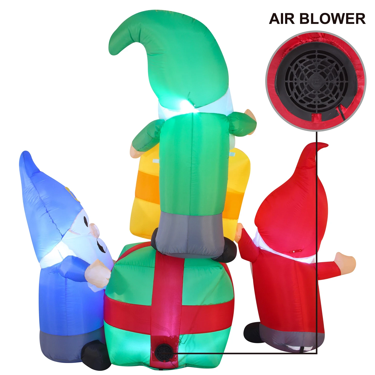 - Our 6 feet long gnomes stacking gifts inflatable comes with an extended cord, ground stakes, fastened ropes, built-in sandbags, and a plug with UL certification.