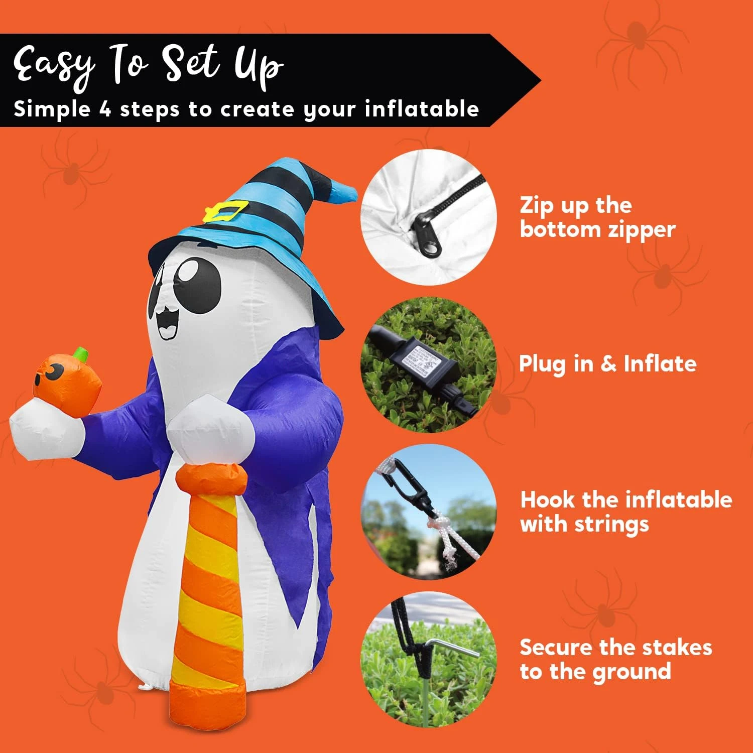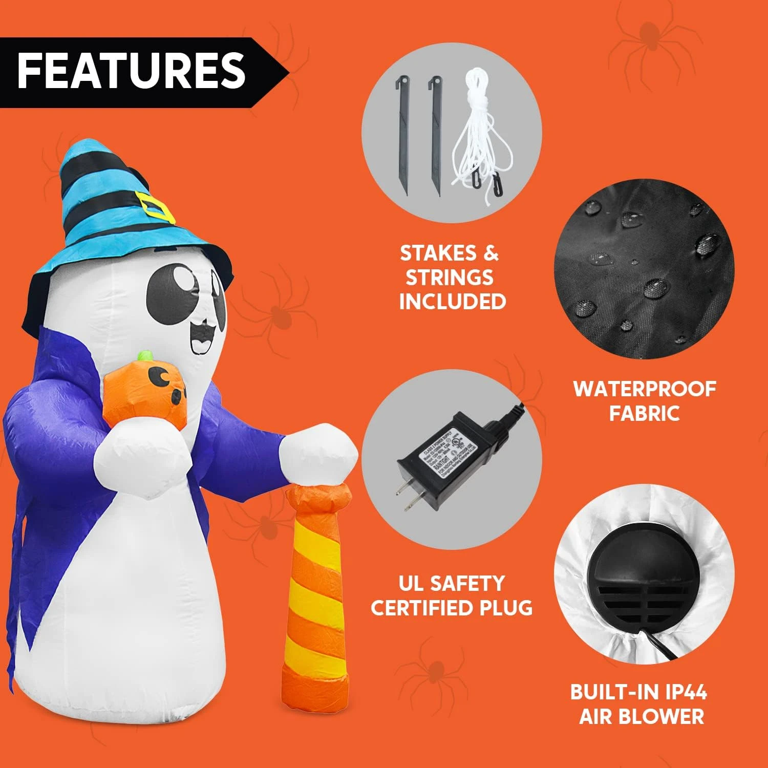 - Our 6 feet tall Cute wicked Ghost inflatable designed with witch hat, flame light and orange candy cane stick. Dump adorable ghost Halloween Inflatable comes with extended cords, ground stakes, fastened ropes, built-in sandbags, and a plug with UL certification.