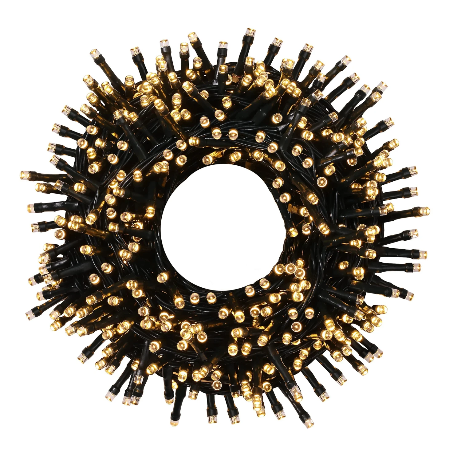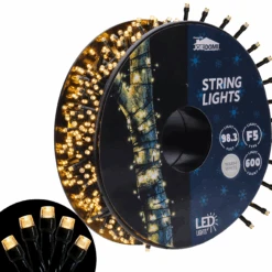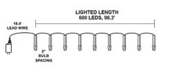 - Our LED string Christmas lights have 600 bright warm white LED bulbs with green wire. Lighted length of 98.3 feet. Features 8 lighting modes. Low voltage.