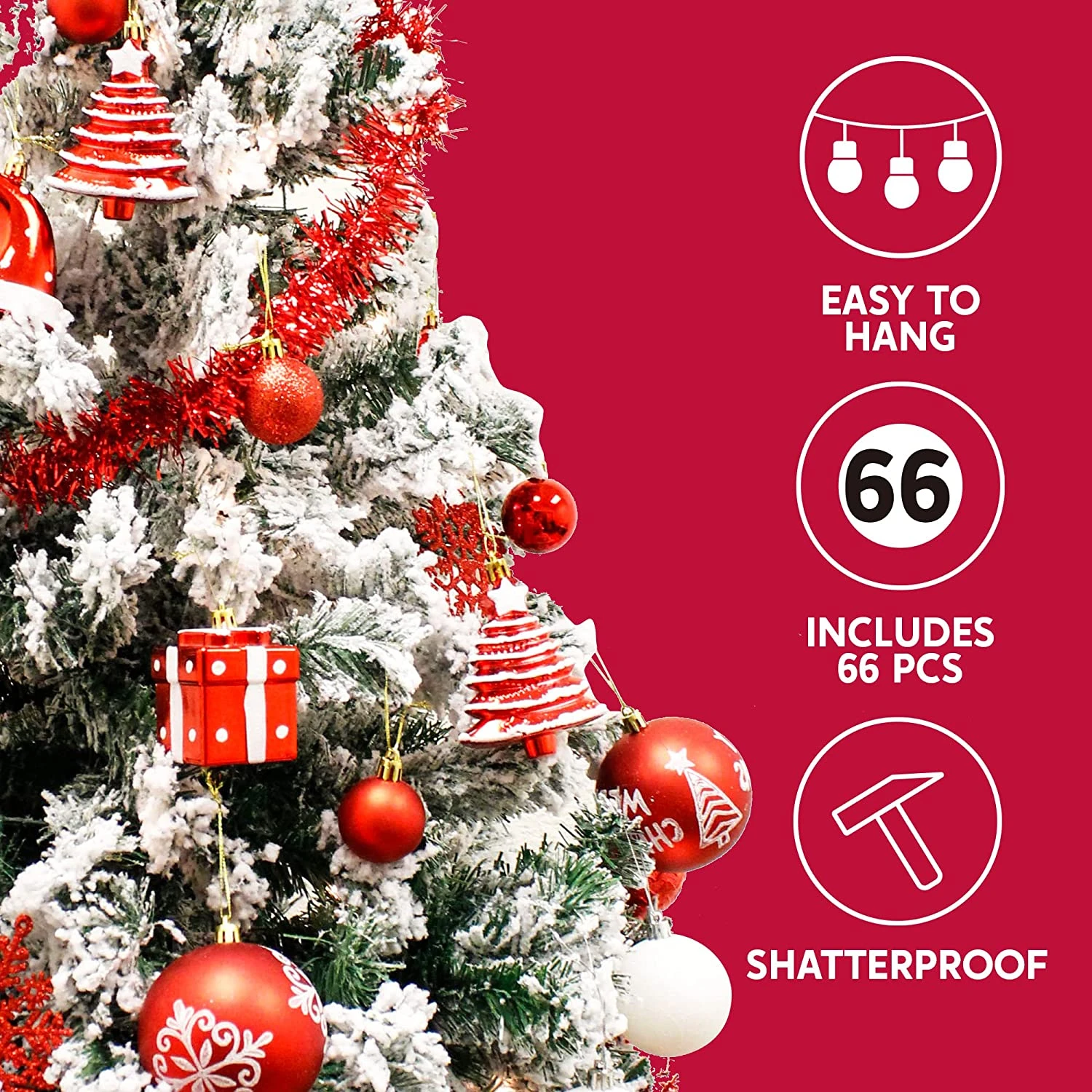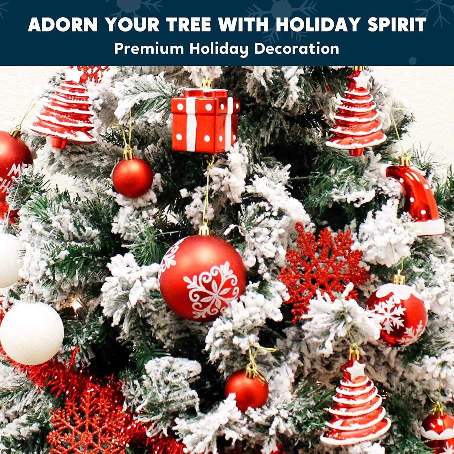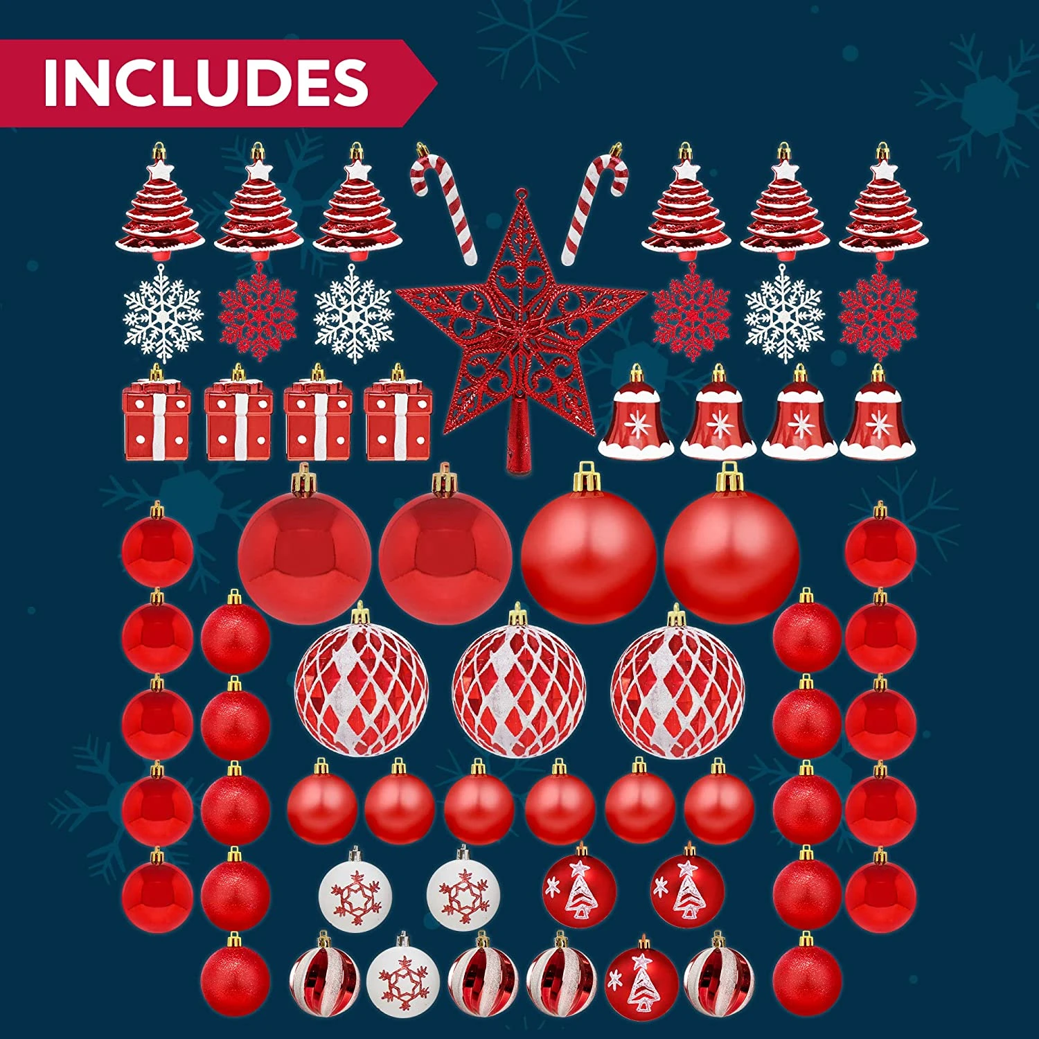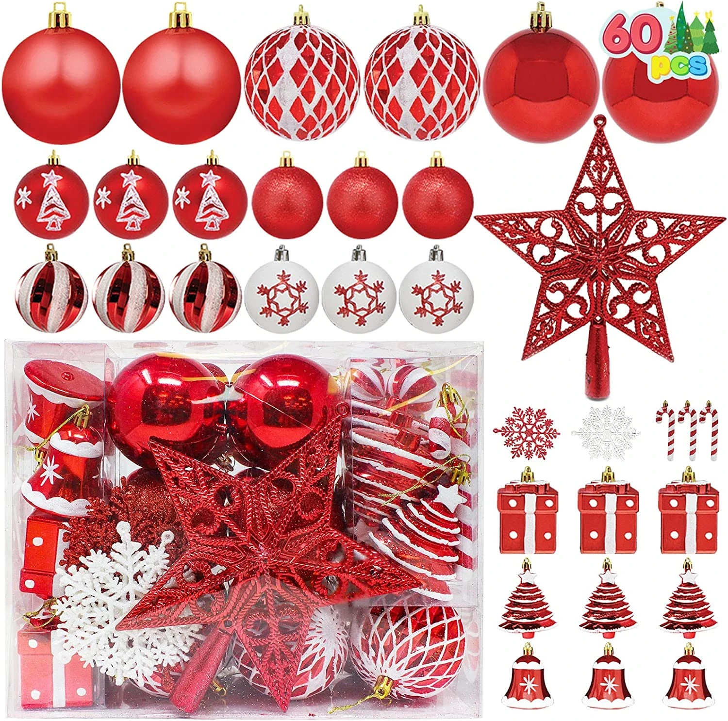 - SUPER VALUE PACK. Our Christmas Ornament Set includes 12 Red Glitter Balls, 12 Red Shiny Balls, 6 Red Matte Balls, 6 Christmas Trees, 4 Swirls Balls, 4 Bells, 4 Gift Boxes, 3 Snowflake Balls, 3 Christmas Tree Balls, 3 White Snowflakes, 3 Red Snowflakes, 3 Diamond Plaid Balls, 2 Candy Canes, 1 Red Star Tree Topper.