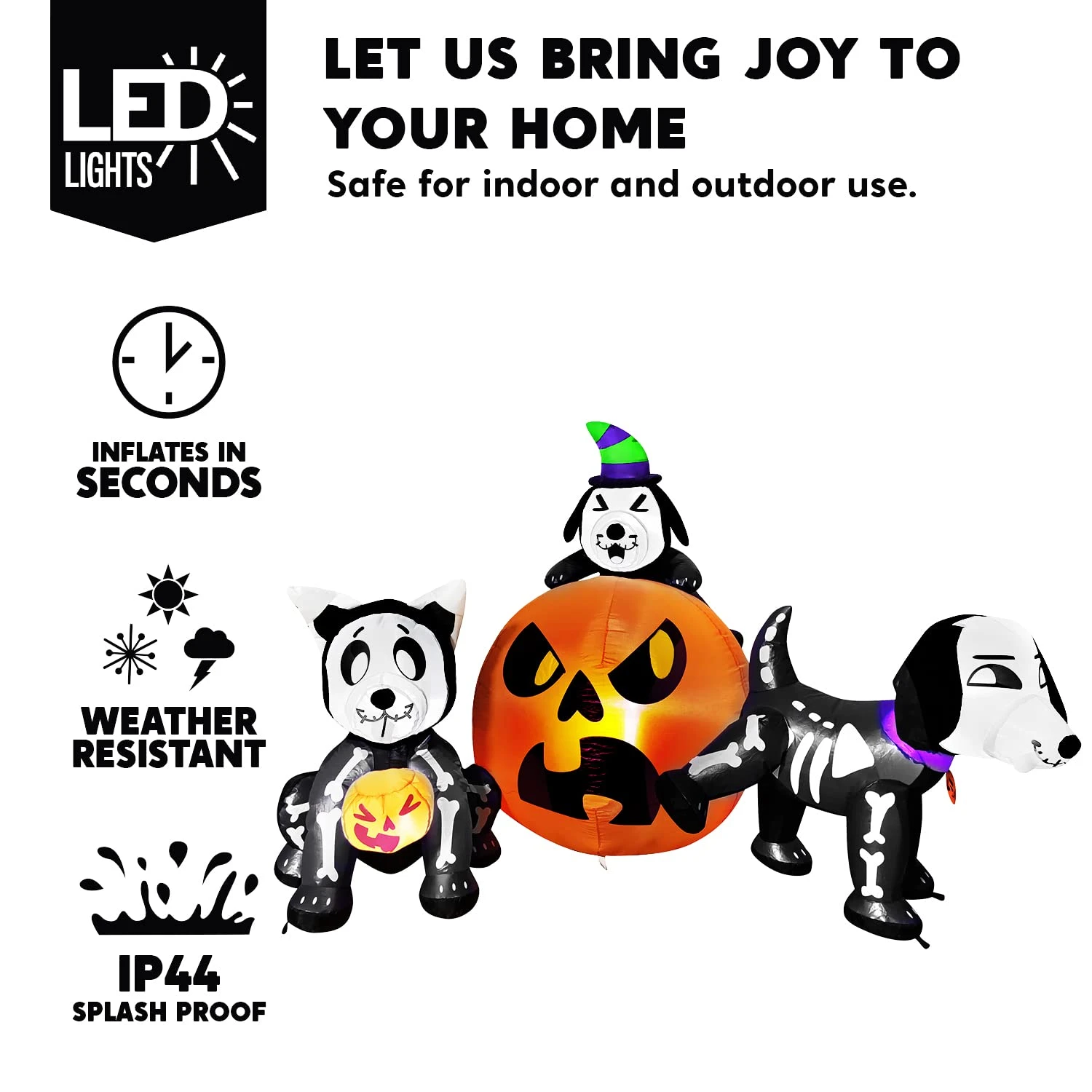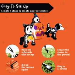 - Our 6 Feet long scary skeleton dog with pumpkin Halloween inflatable comes with extended cords, ground stakes, fastened ropes, built-in sandbags, and a plug with UL certification.