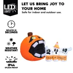 - Our 6 feet long trick or treat – pumpkin eat ghosts Halloween inflatable comes with extended cords, ground stakes, fastened ropes, built-in sandbags, and a plug with UL certification.