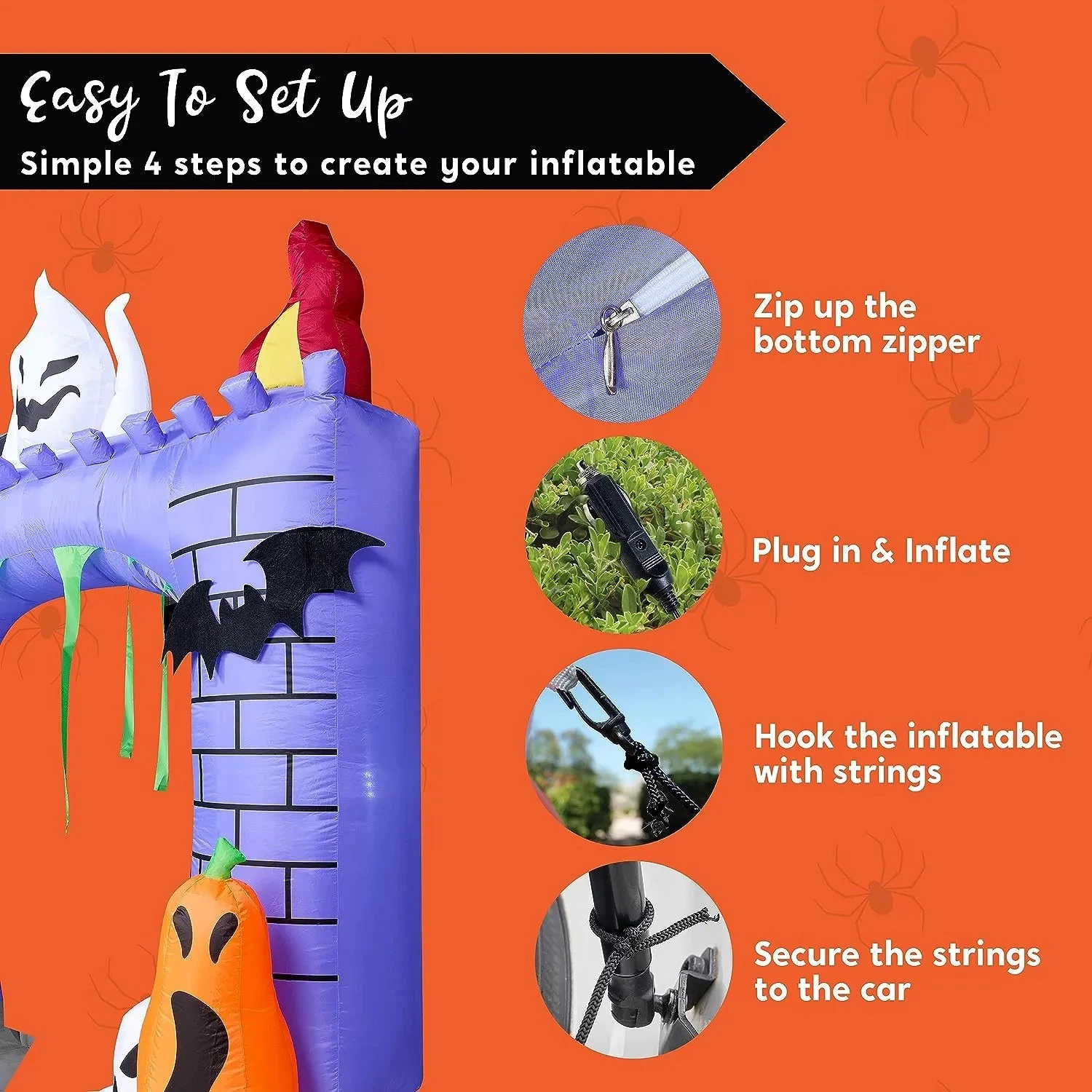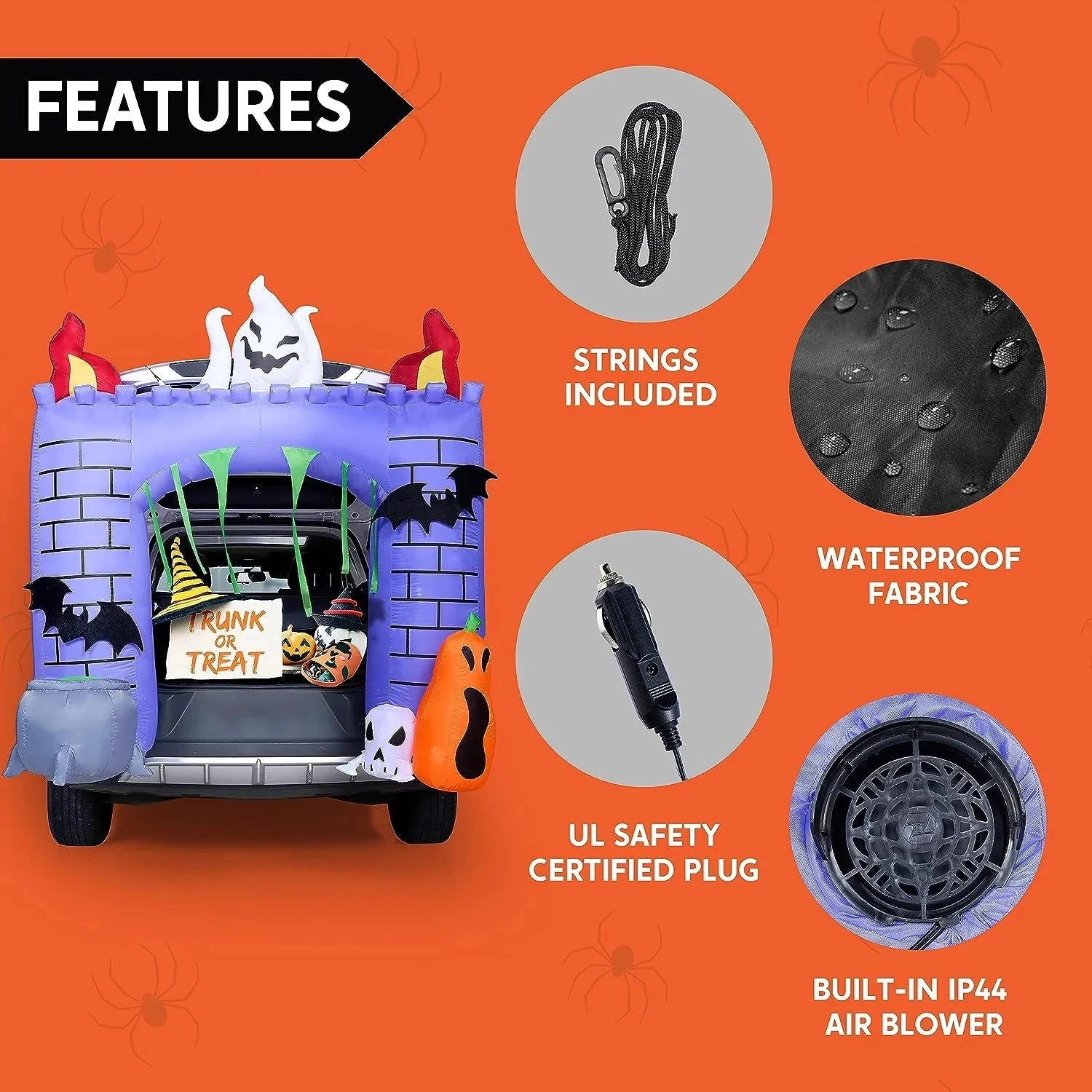 - Excellent Design. This 6 ft tall Halloween inflatable haunted castle with built-in LEDs can be used to decorate the trunk of a car. The attention to detail in the castle’s architecture, coupled with the spooky elements like ghosts, pumpkins, and bats, creates a visually captivating centerpiece for Halloween car decorations. This inflatable comes with an extended cord, ground stakes, fastened ropes, built-in sandbags, and a car cigaratte lighter with UL certification.