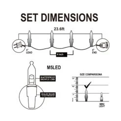 - Our holiday light includes 70Â red &Â green M5 LED green wire string lights that measure 23.6 feet.