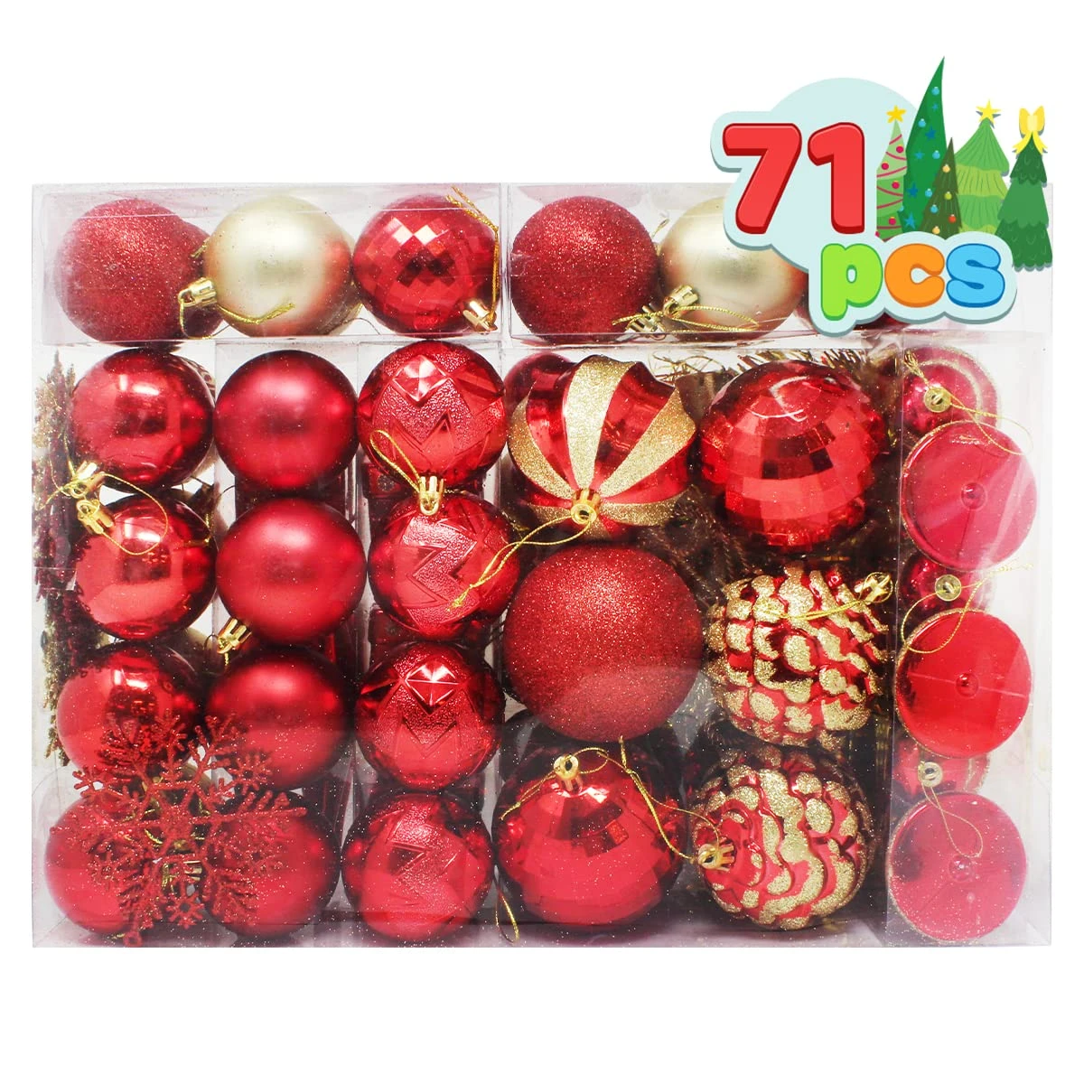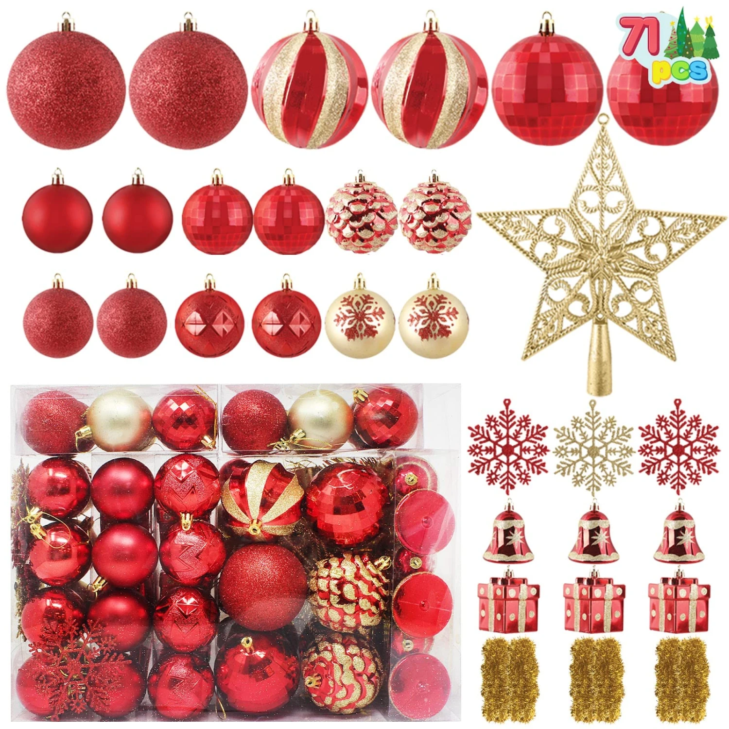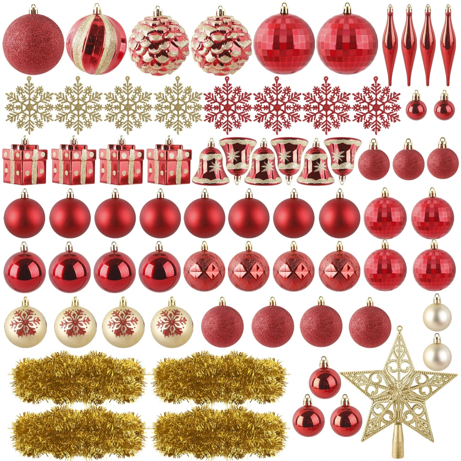 - Our Christmas ornament set includes 8 matte balls, 8 glittery balls, 6 white balls, 6 shiny balls, 6 disco balls, 6 bells, 5 white snowflakes, 5 blue snowflakes, 4 geometric balls, 4 snowflake balls, 4 gift boxes, 4 snowflake icicles, 2 snowy pinecones, 1 swirls balls, 1 tinsel garland, 1 silver star tree topper.