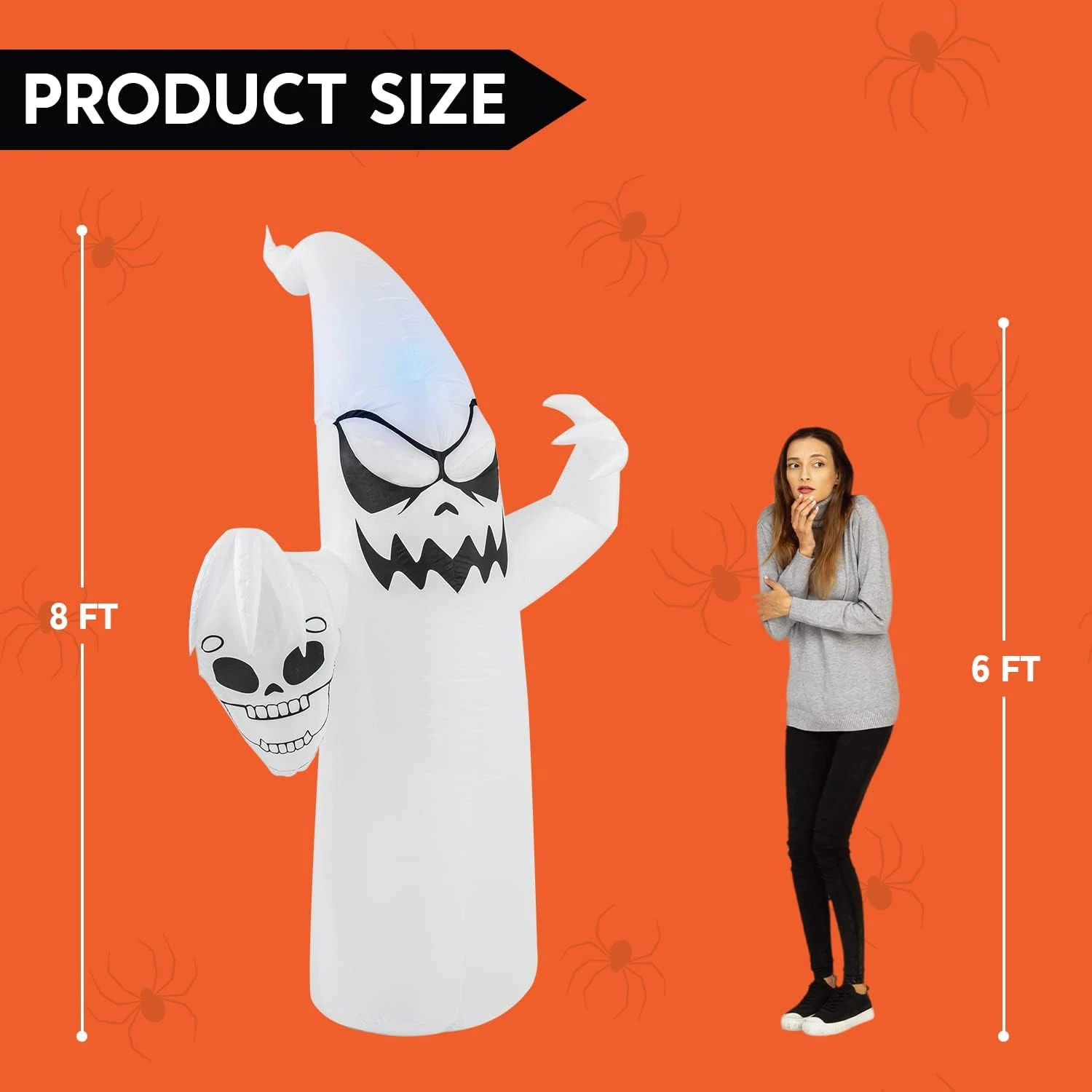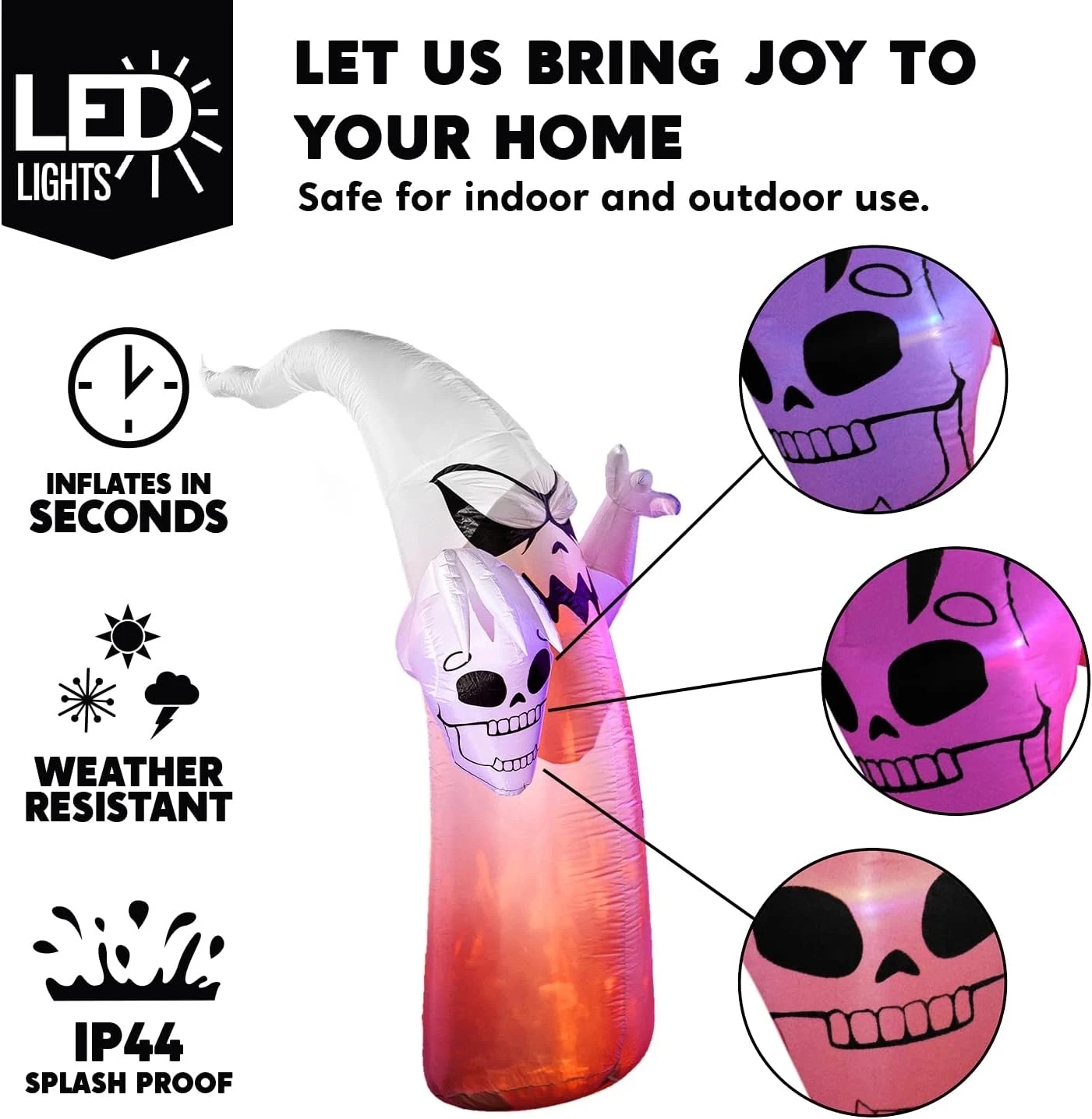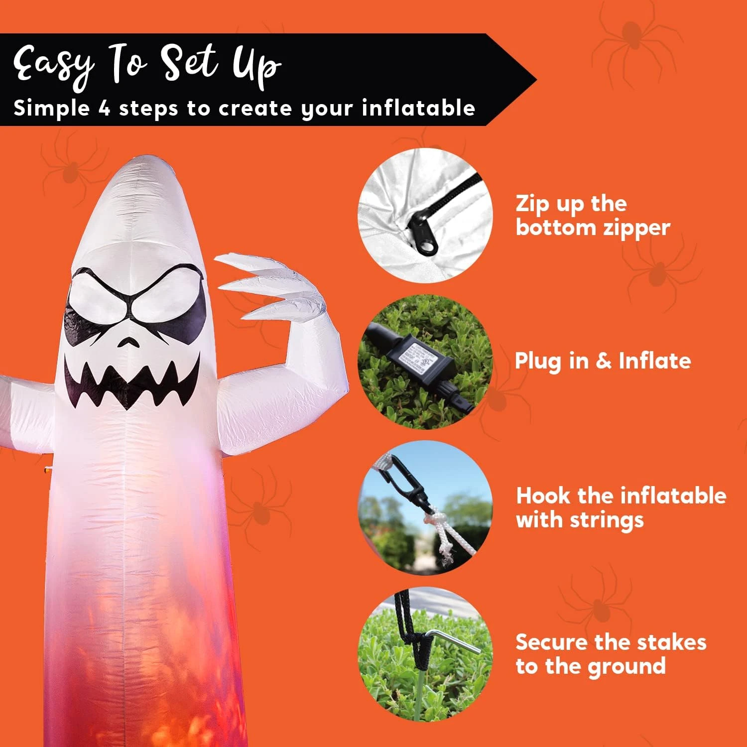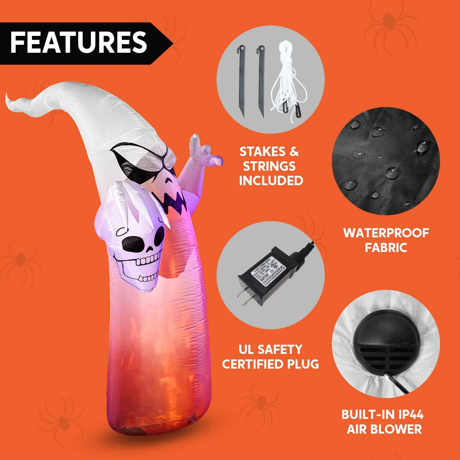 - Our 8 feet tall Scary Fire Light Ghost Inflatable with Dump Color Changing Skeleton Head Inflatable comes with extended cords, ground stakes, fastened ropes, built-in sandbags, and a plug.