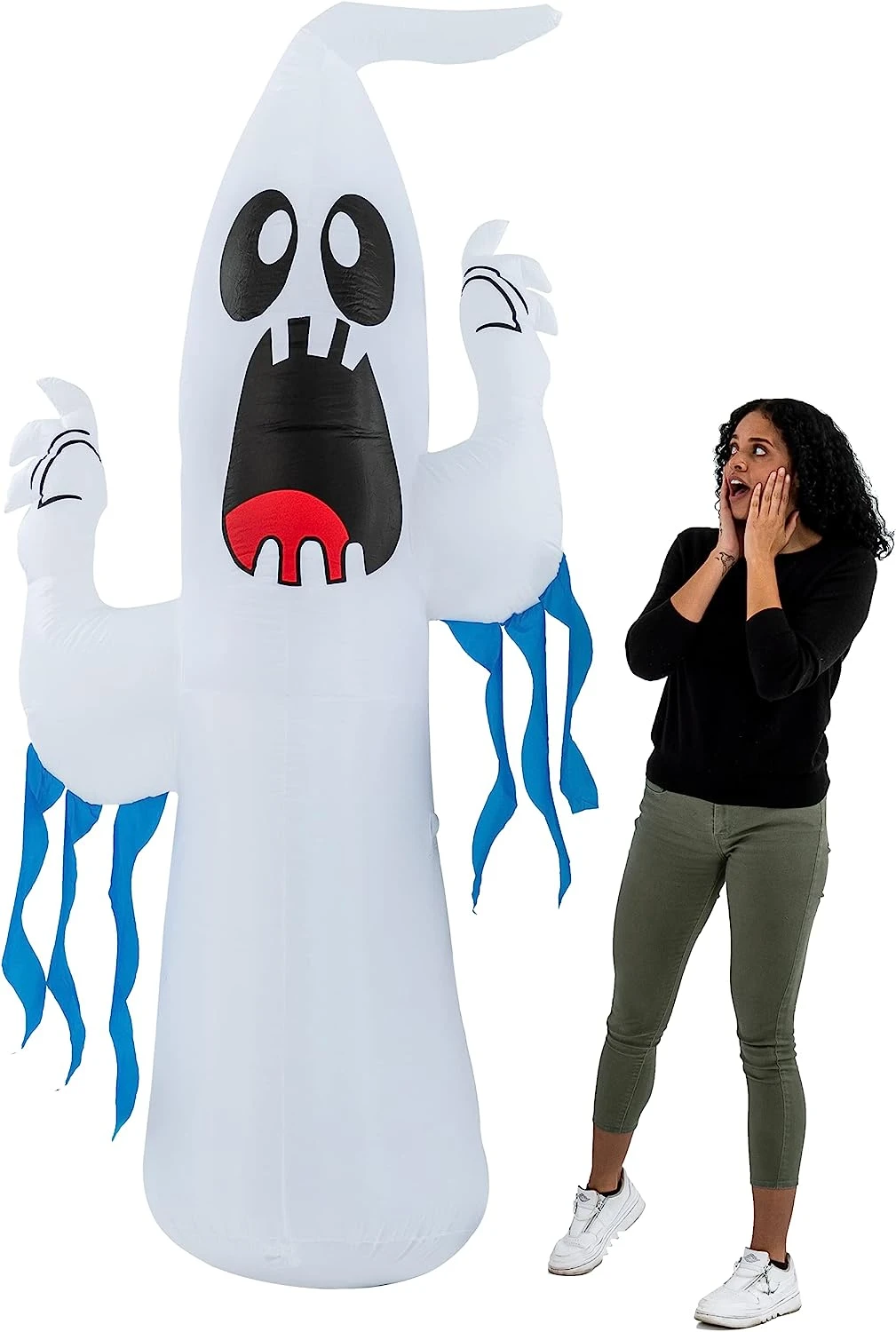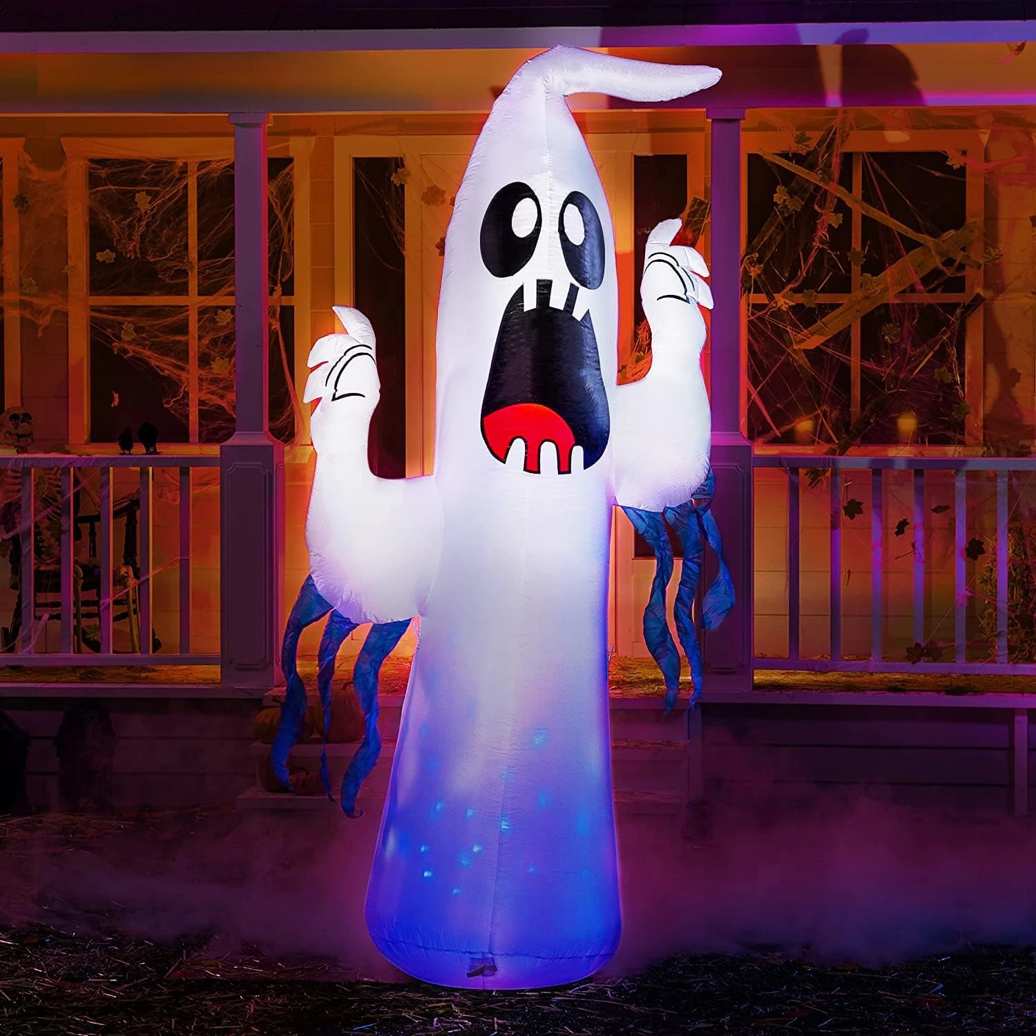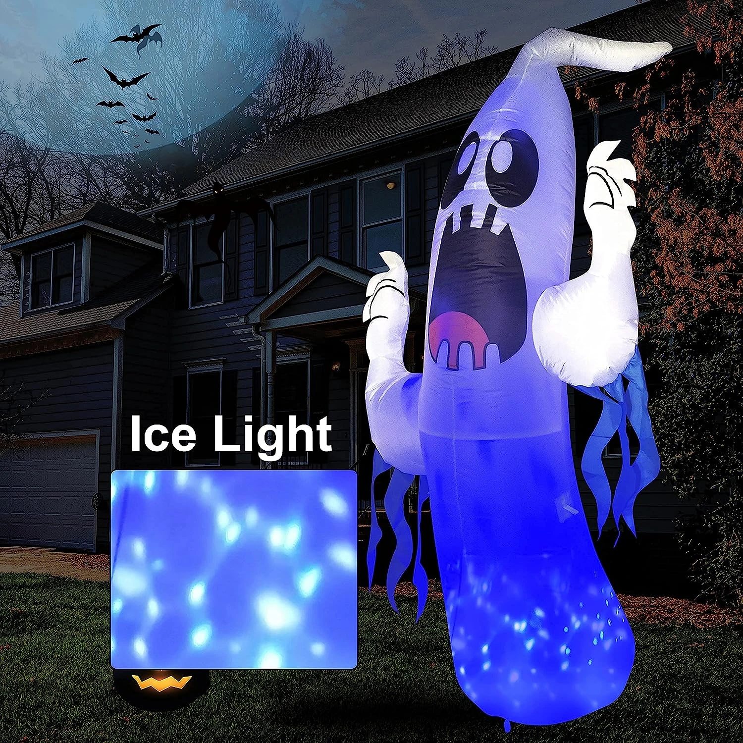 - Our 8 feet tall scary Halloween ghost inflatable with blue ice light and ribbon comes with extended cords, ground stakes, fastened ropes, built-in sandbags, and a plug with ul certification.