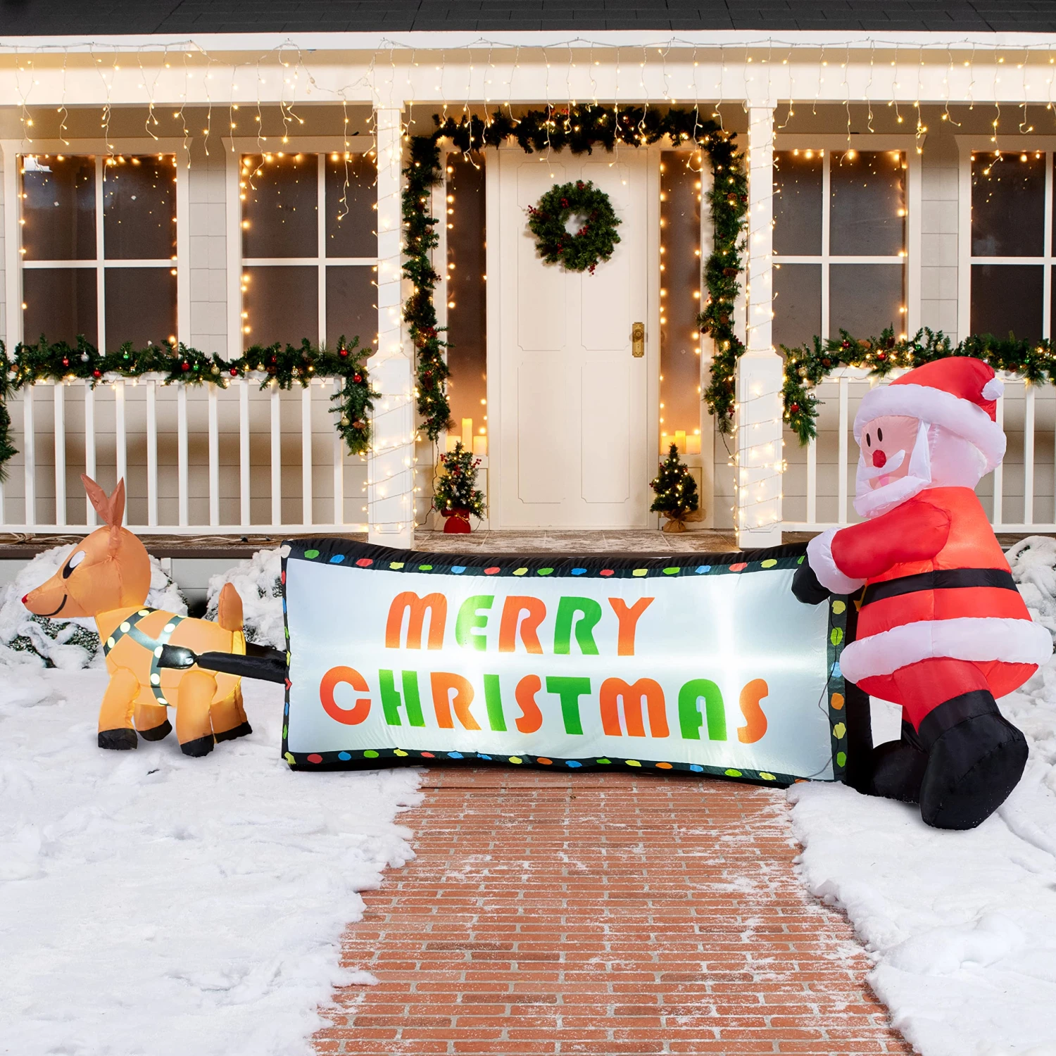 - Our 8 feet long reindeer pulling a banner with Santa banner inflatable comes with an extended cord, ground stakes, fastened ropes, built-in sandbags, and a plug with UL certification.