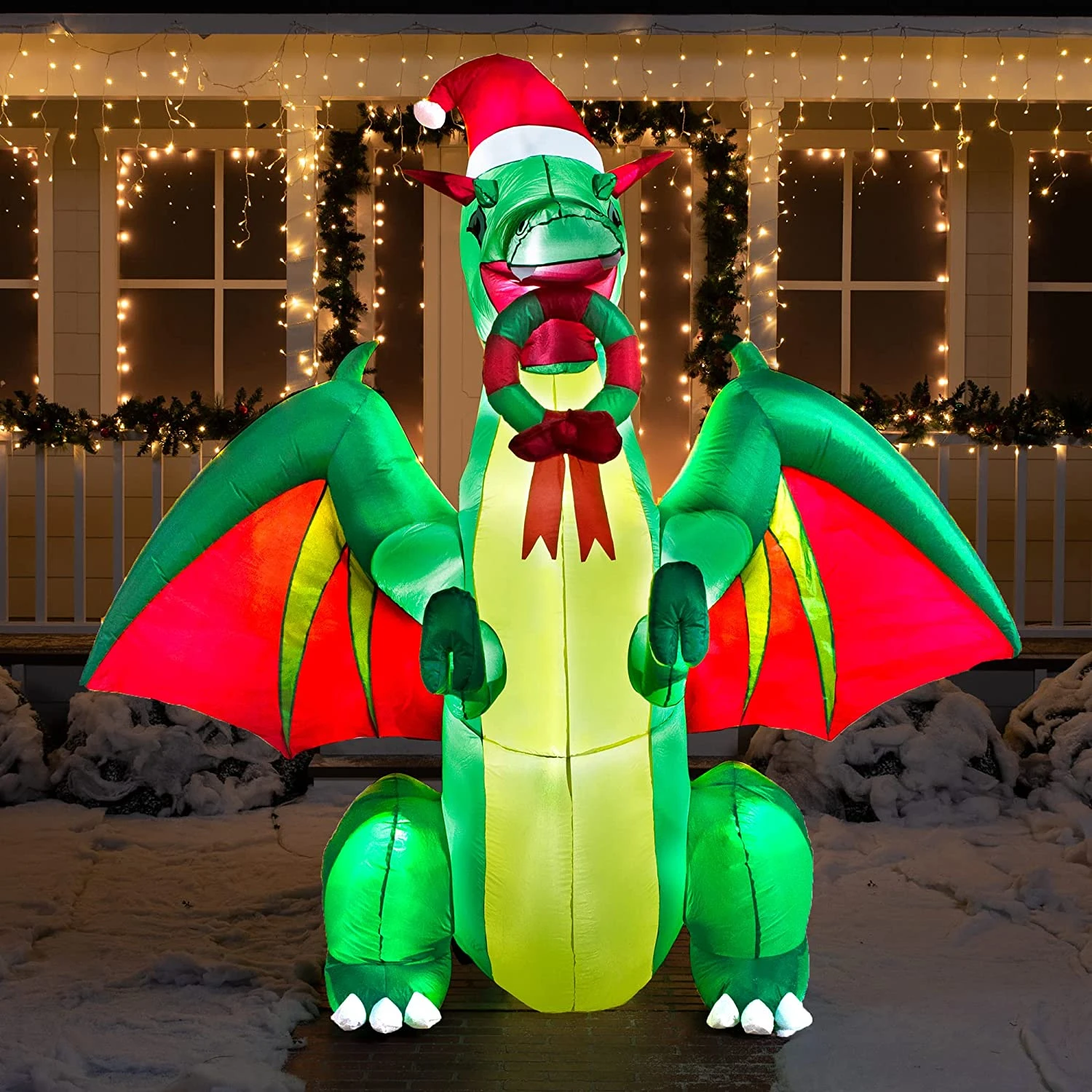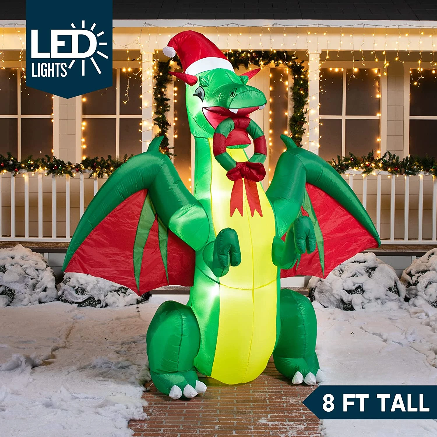 - Our 8 feet tall 8 ft Tall Realistic Christmas Green Dragon Christmas Inflatable comes with an extended cord, ground stakes, fastened ropes, built-in sandbags, and a plug with UL certification.