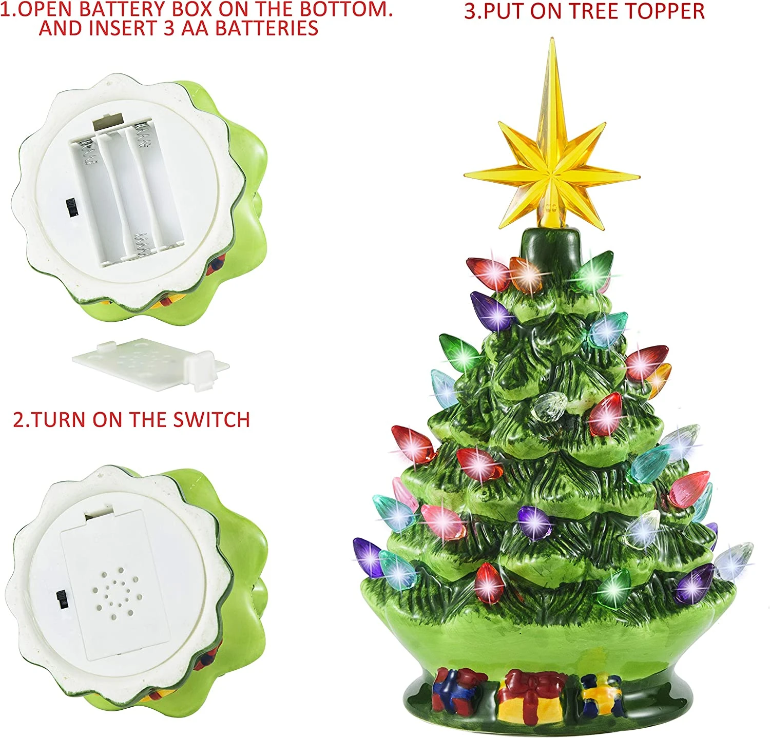 - Our 9.5″ Prelit Tabletop Christmas Tree (include star topper) is made of glossy ceramic, with multicolored bulbs, transparent star topper. Plus 1 extra yellow star topper and 10 bulbs. The tree is powered by a battery box (batteries are not included)