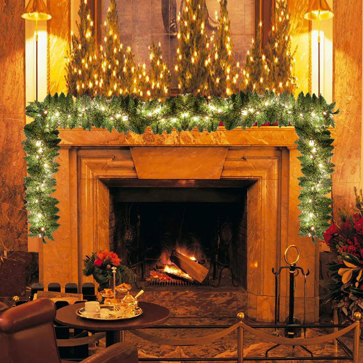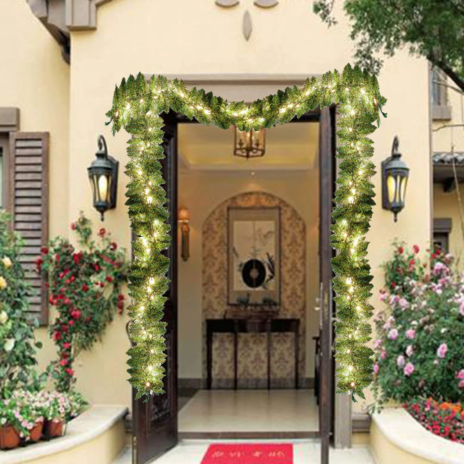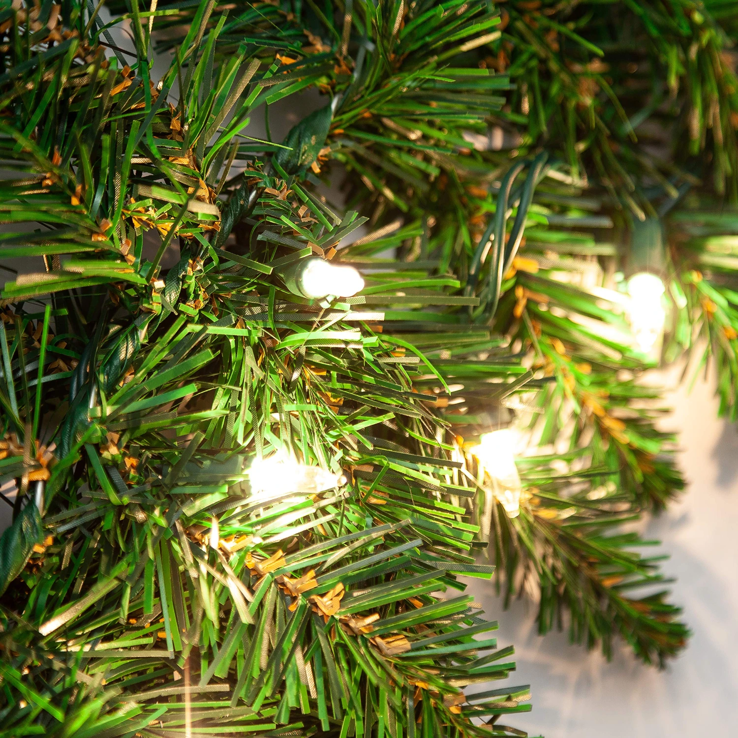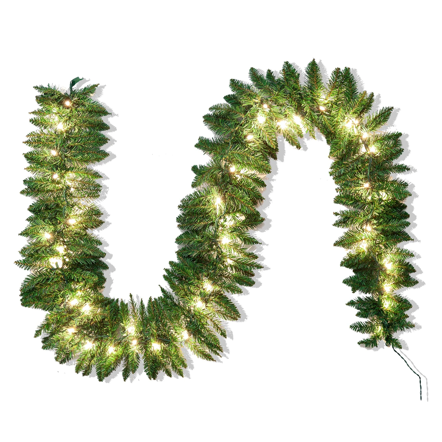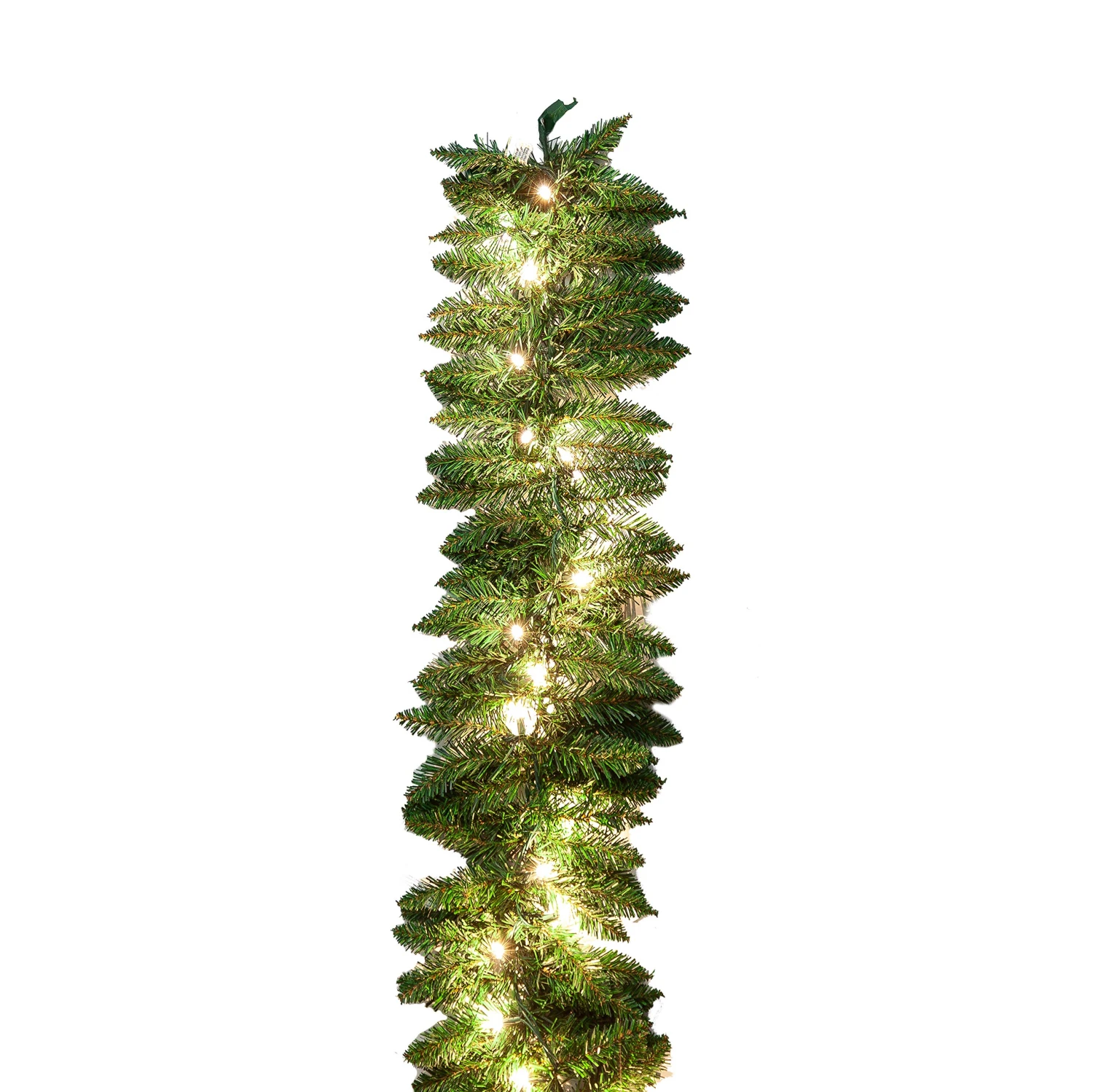- Our Christmas Pine Garland is pre-lit with warm white clear lights. Also, the garland is designed with an end socket to connect another light-up garland. It measures 9 ft. long and 10-inch diameter, which is good for home or office decoration