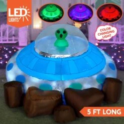 Excellent Design. This 5ft Halloween inflatable crashing UFO alien decoration features a creative design with a UFO and an alien. The attention to detail in the design makes it a standout piece for your Halloween decorations. This inflatable comes with an extended cord, ground stakes, fastened ropes, built-in sandbags, and a plug with UL certification.