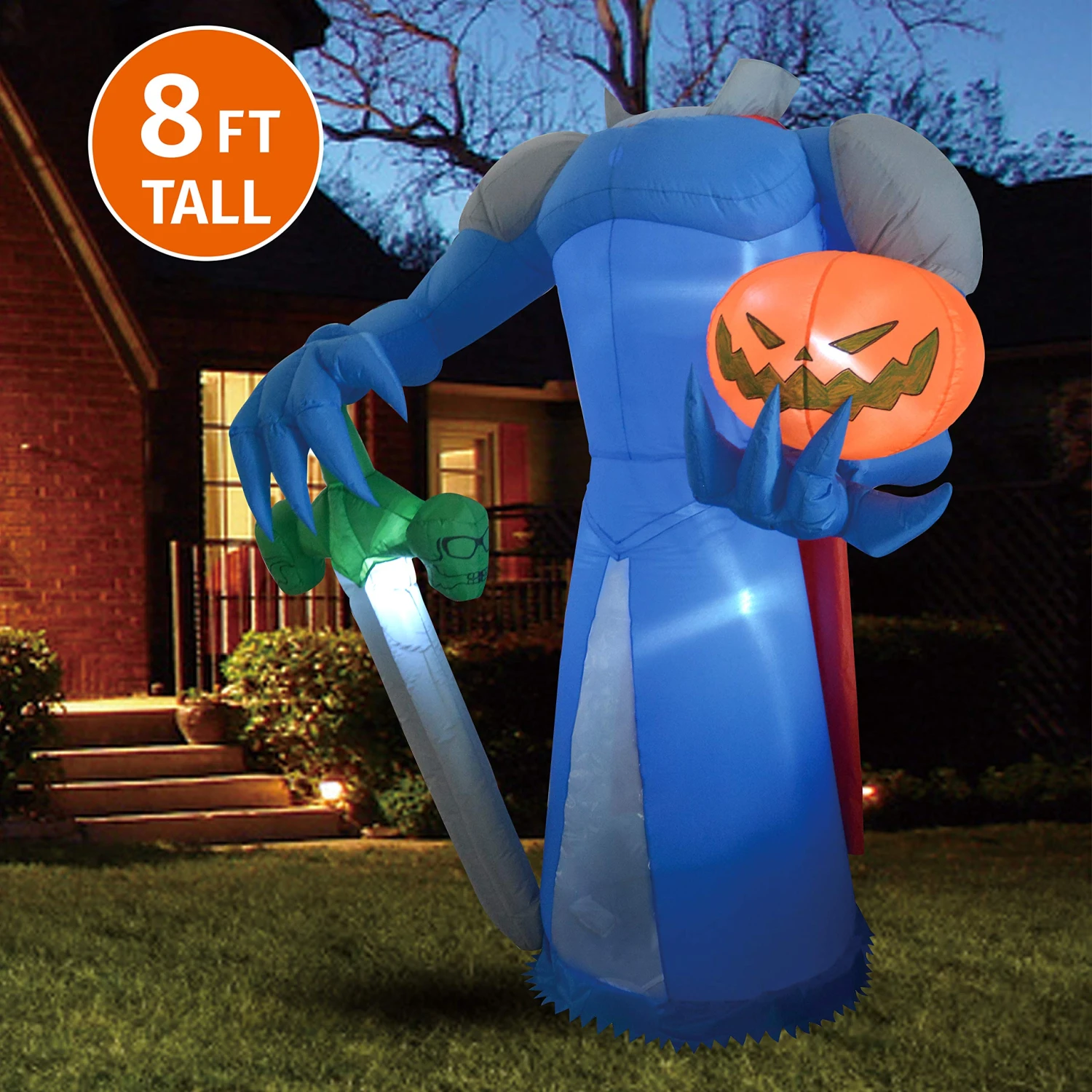 - Our 8 Ft Inflatable Pumpkin Knight. Goofy Spooky Convenient Halloween Holiday Yard Decoration Comes with 10ft extended cord, ground stakes, fastened ropes, and built in sandbags.Â