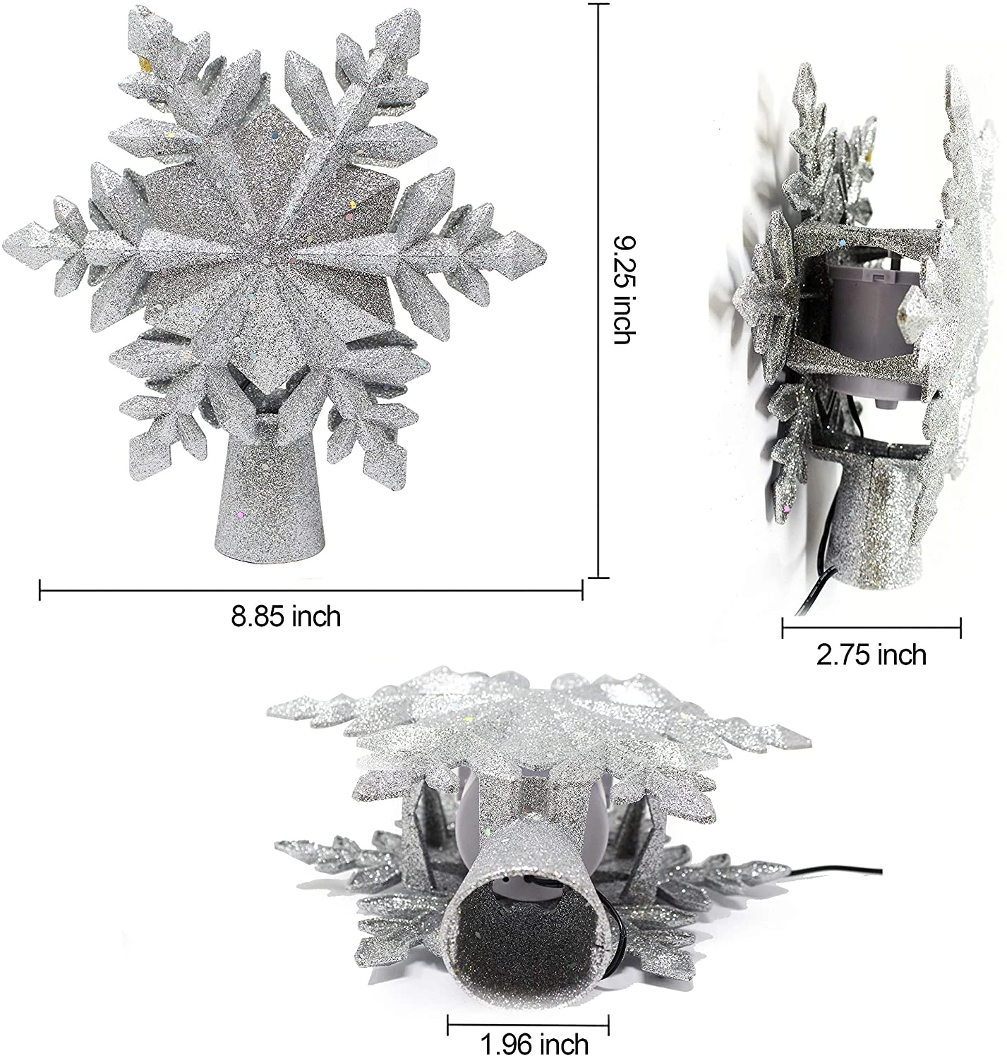 - CLASSIC DESIGN. Glitter Silver Snowflake glitters design with perfect size. Brilliant shining with the gold glitter all covered the toppers, give you the best mood for Christmas day. Perfect fit for 6ft to 7ft Xmas tree.
